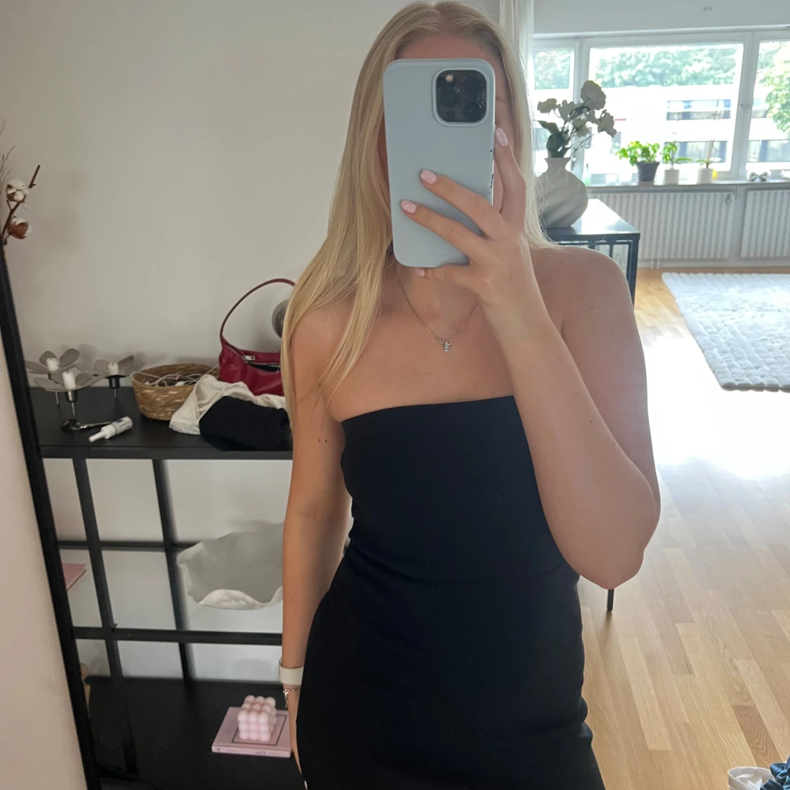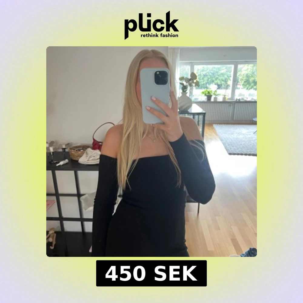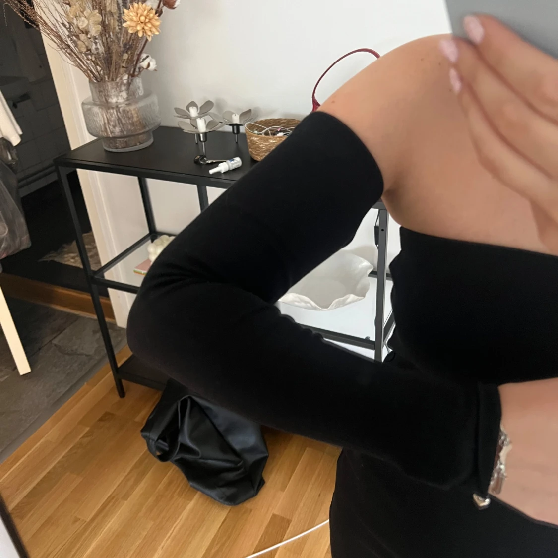 Säljer en svart, tight och stilren kort klänning med offshoulder-design och långa ärmar till, från Djerf avenue.