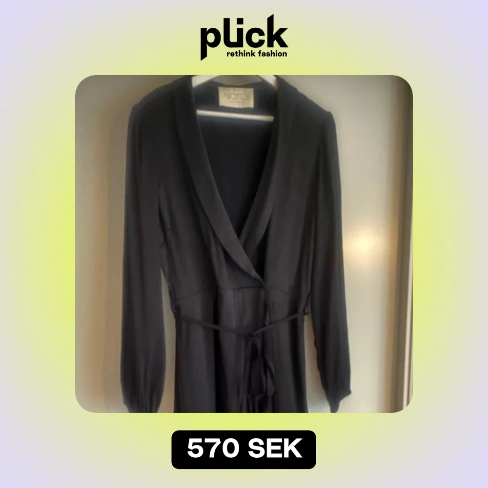 Knappt använd jättefin klänning med tungt härligt fall. Omlott med knappar och skärp. Ärmarna har elastiska band så man kan dra upp dem om man vill. Osymmetriskt fall så lite längre bak. Svårt att ta rättvisa bilder men hör av dig om du vill.