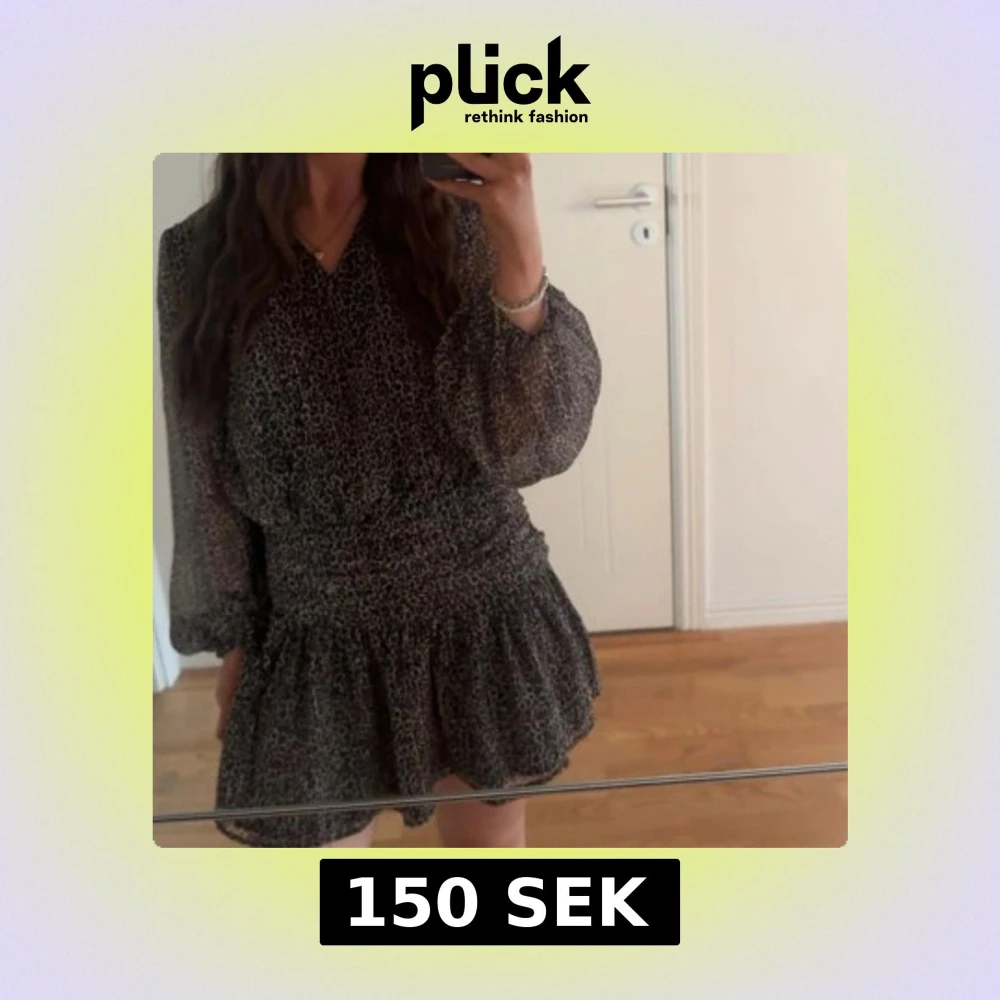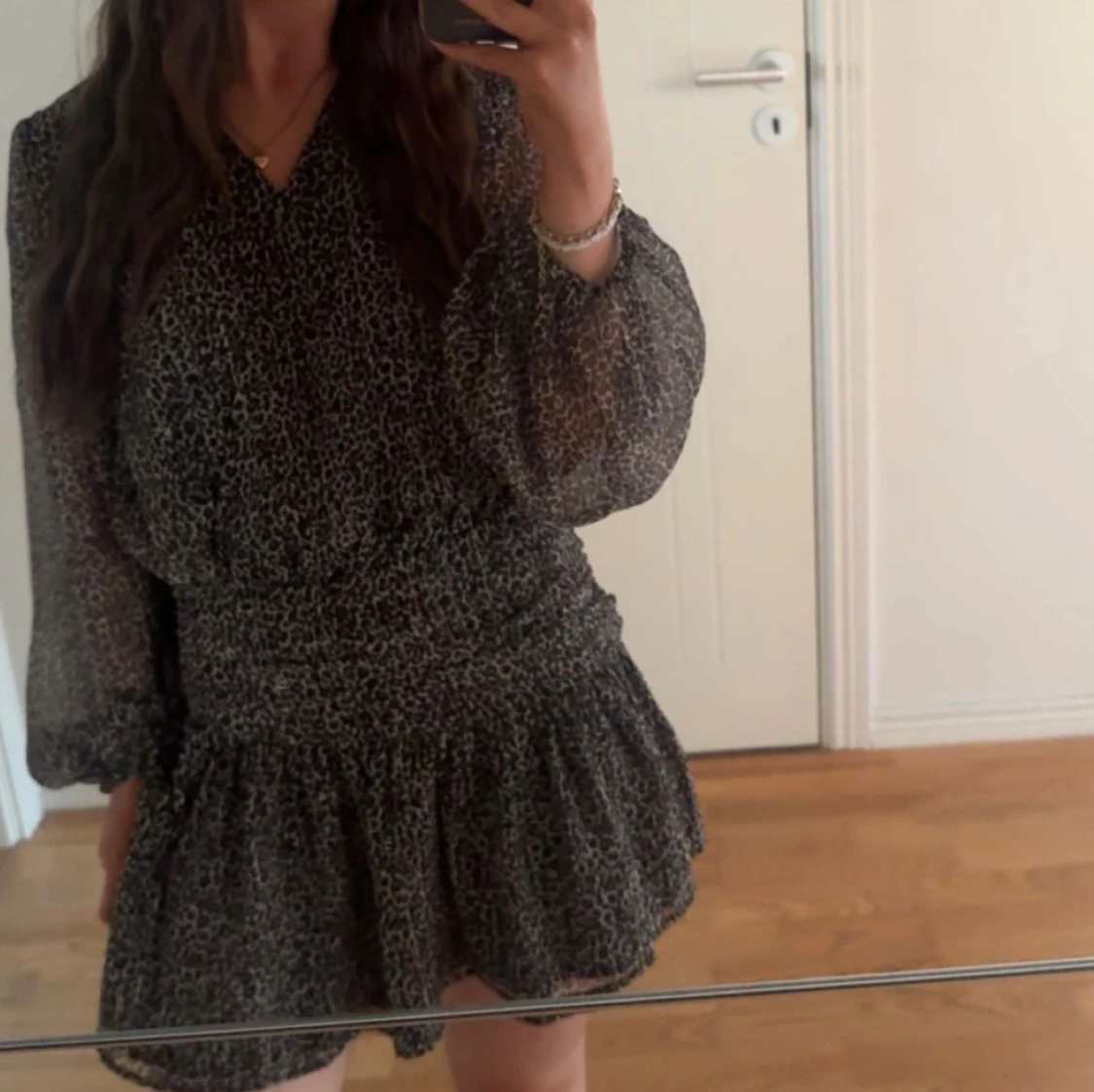 Säljer en kort klänning med leopardmönster och volangkjol. Klänningen har långa, transparenta ärmar och markerad midja. Perfekt för dig som gillar trendiga och djurmönstrade plagg. Från Gina Young storlek 158