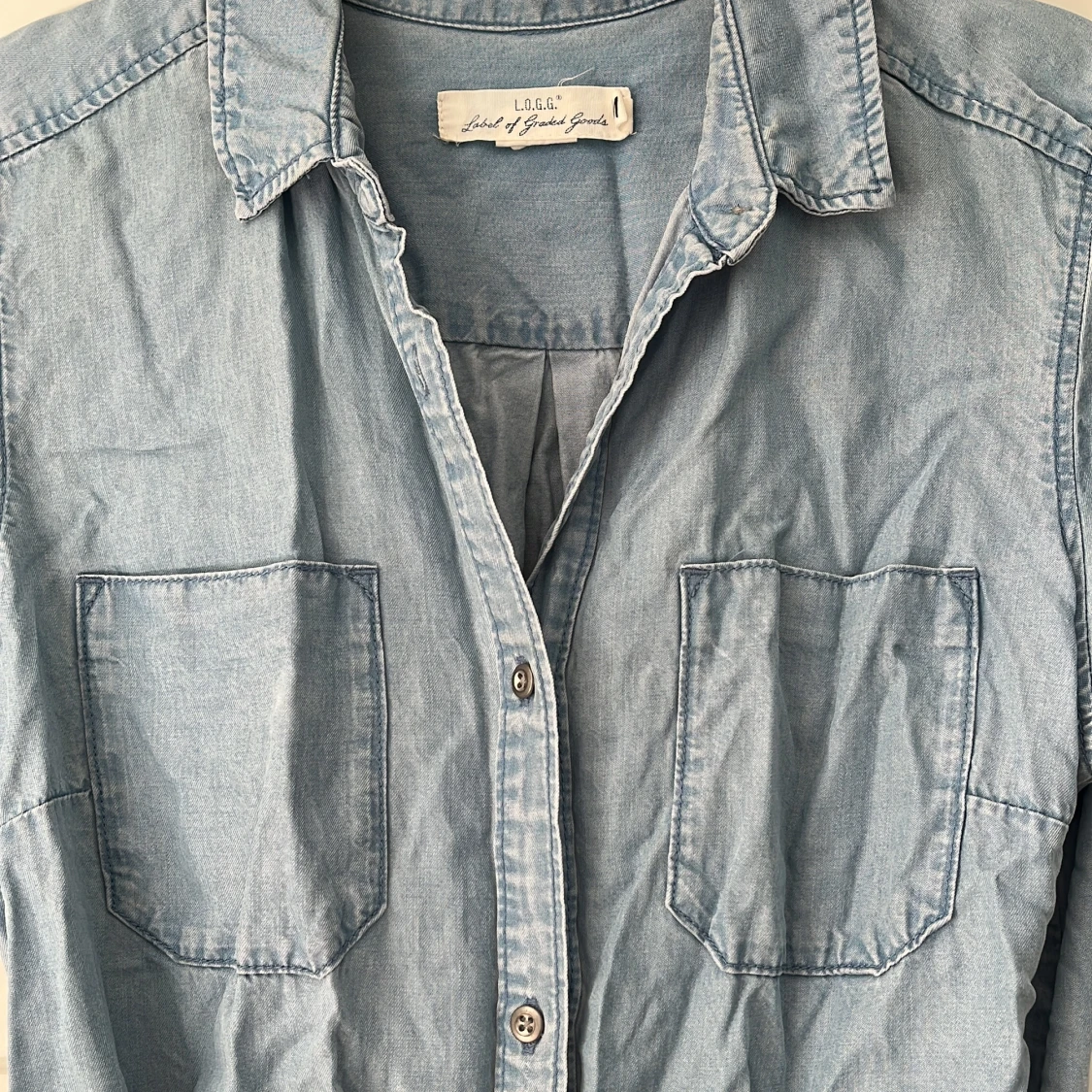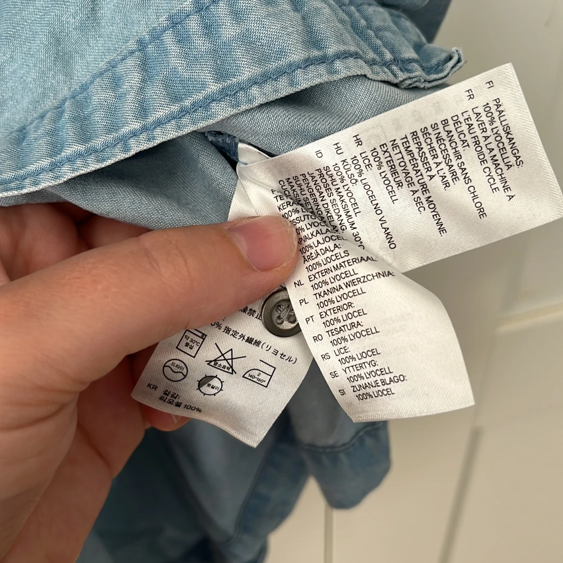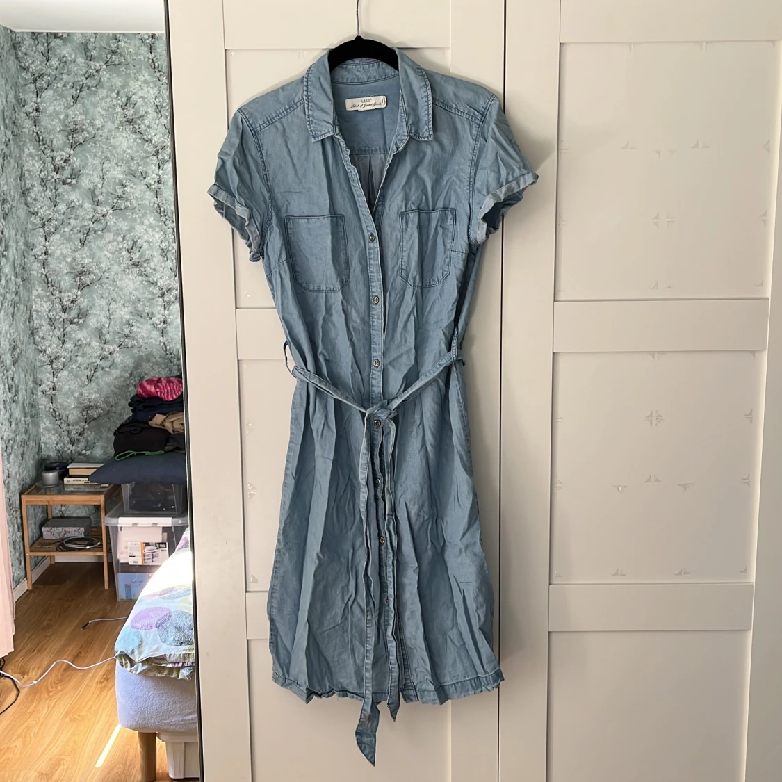 Ljusblå klänning från H&M med knappar i mitten hela vägen samt band som går att knyta i midjan. Två bröstfickor. Storlek: 38. Material: 100% lycocell. I använt skick, men inga skador eller förslitningar.