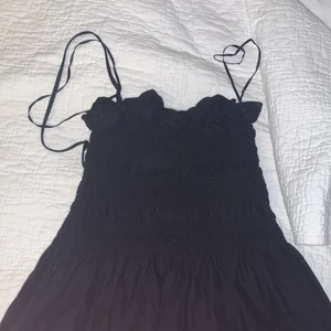Lång svart klänning som går ner till fötterna / vaderna, nåt mittemellan. Man kan välja om man vill va band eller ej. Storlek xs från hm