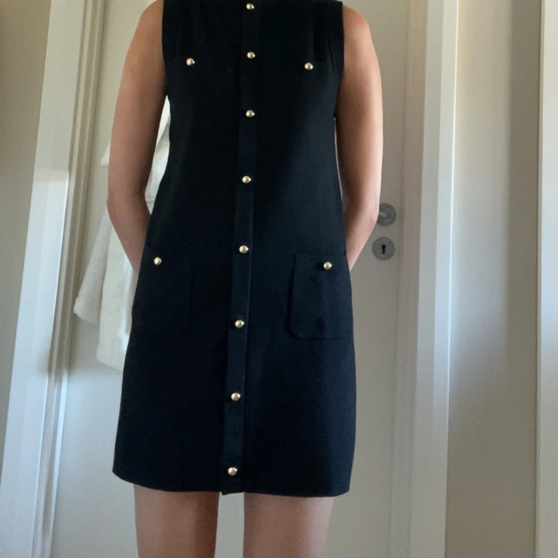 Snygg svart ärmlös kortklänning med raka linjer och guldiga knappar framtill. Super nice nu till hösten. Helt oanvänd