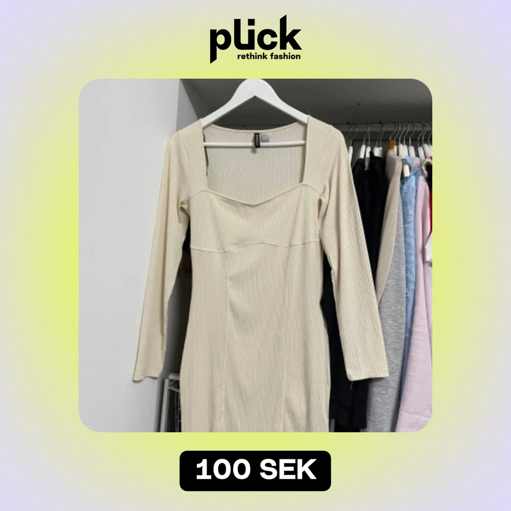 Säljer en superfin beige klänning från Divided. Den är ribbad och har en snygg fyrkantig urringning. Klänningen är långärmad och har en tight passform som framhäver figuren. Perfekt för både vardag och fest! Endast använts en enda gång.