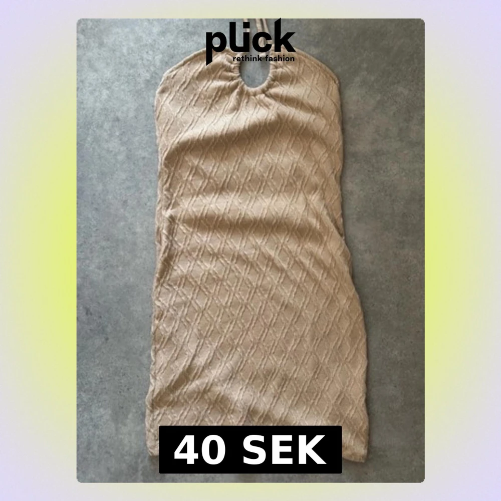 Snygg beige kort stickad klänning med halterneck och knyt i nacken. Klänningen har ett diskret mönster i tyget och är perfekt för varma dagar. Mjuk och bekväm med en lätt figurnära passform.