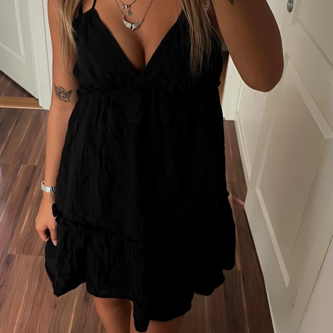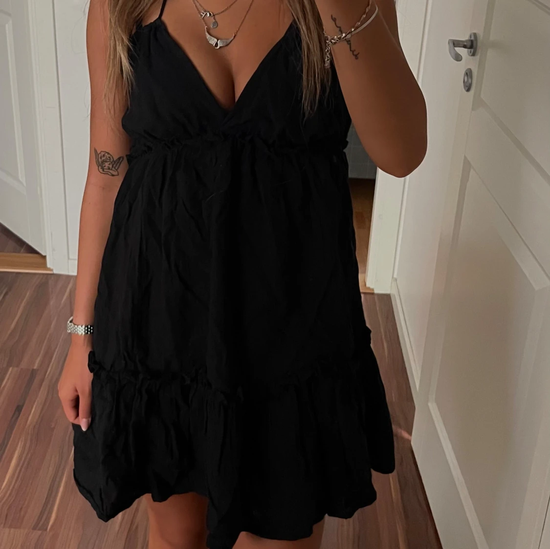 Svart puffig klänning från H&M i stl xs. Legat längst in i garderoben och blivit skrynklig så ska såklart tvättas innan postning😭❤️nypris var 350kr. Säljer även samma modell i vit(annan annons)