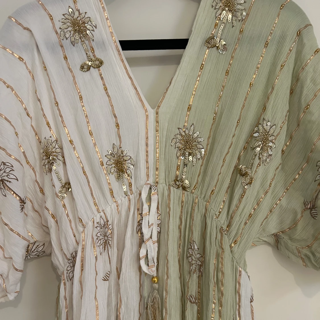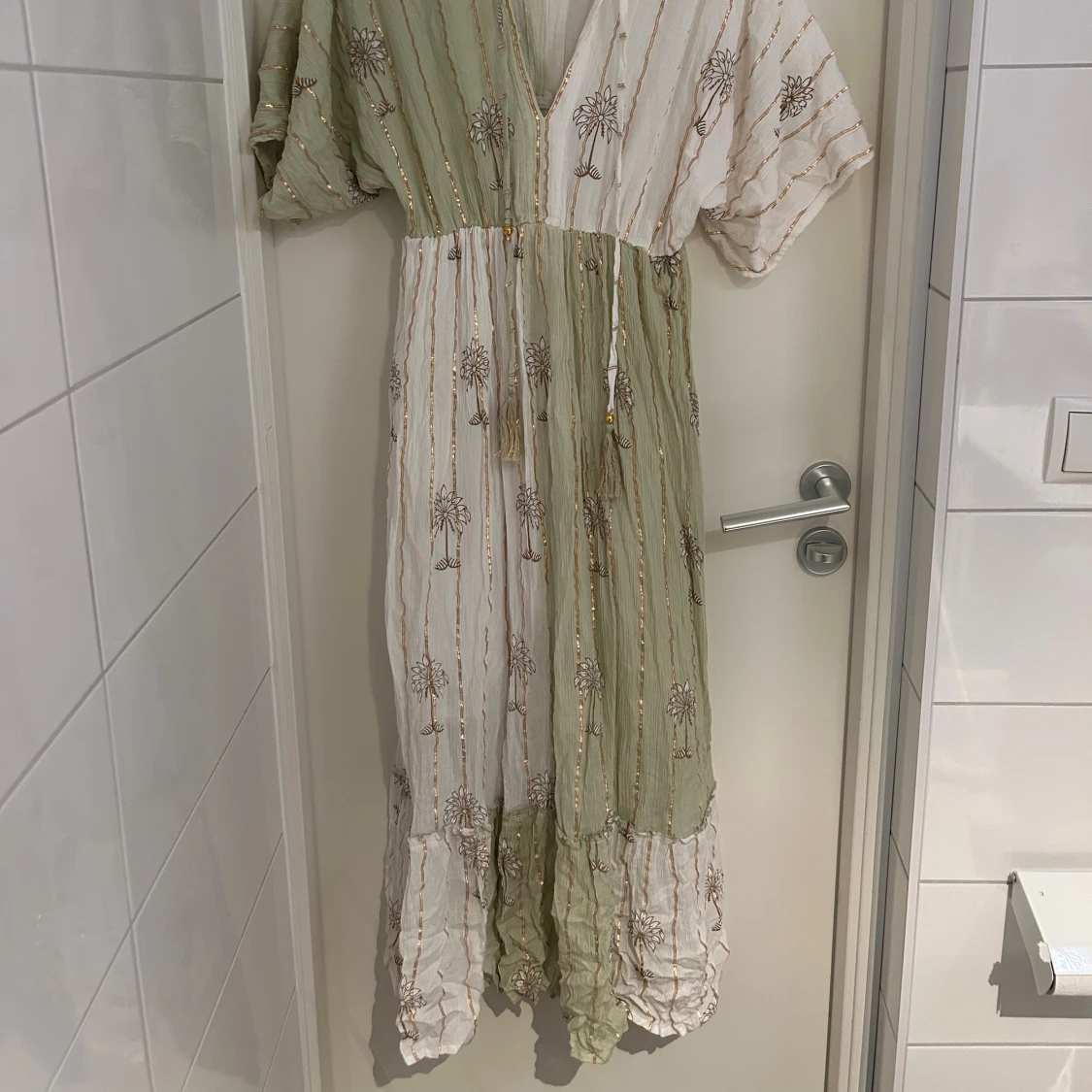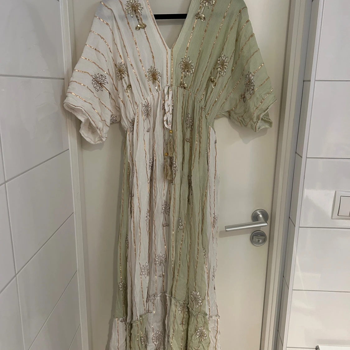 Superfin långklänning i Positano-stil med v-ringning och korta ärmar. Klänningen är i vitt och ljusgrönt med guldiga broderier och paljettdetaljer, samt knytband i midjan. Materialet är lätt och luftigt. Aldrig använd