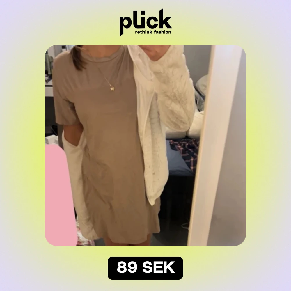 En jätte fin klänning. Vet inte vad det är för material men det är inte vanlig bomull det är typ nån velour, den är beige/rosa typ