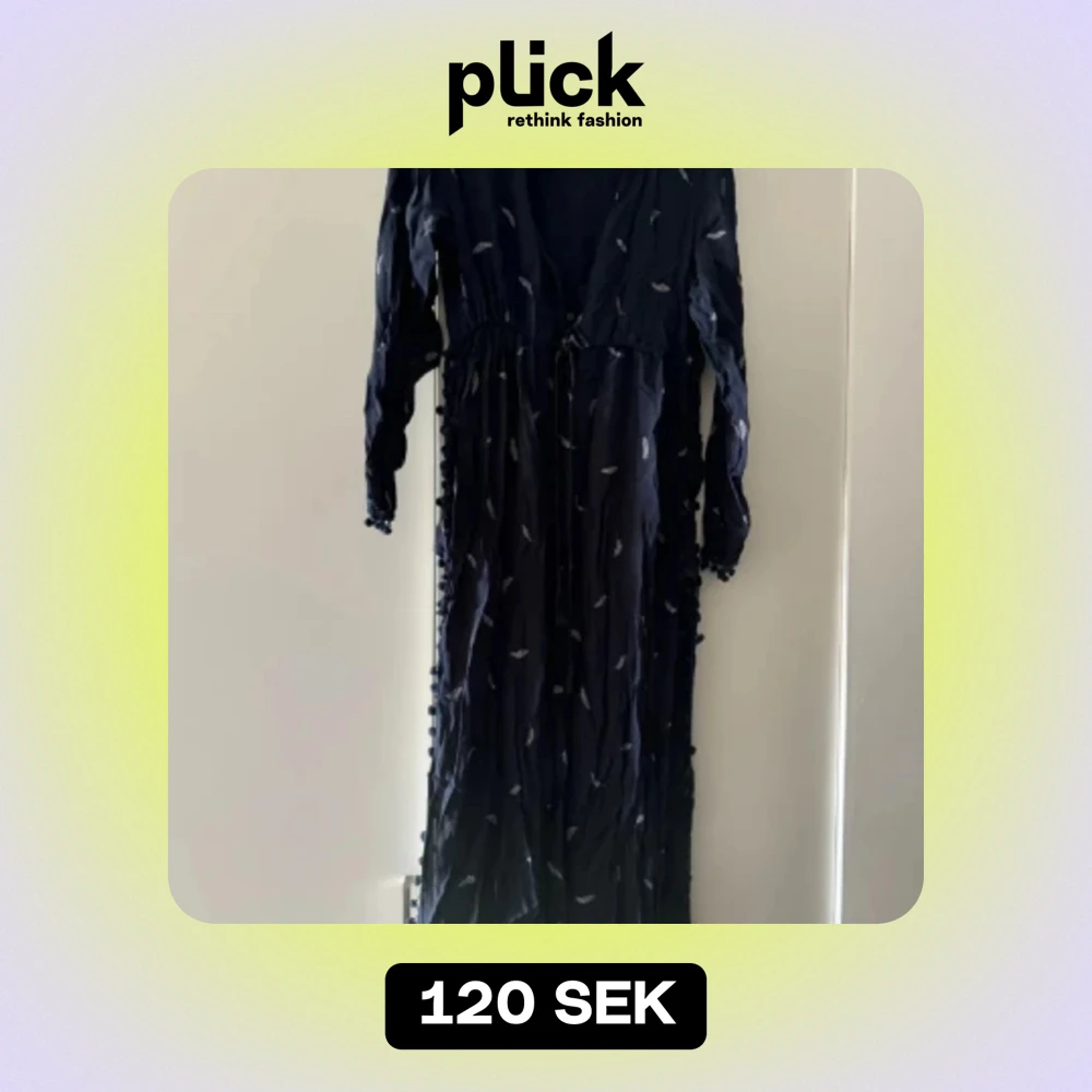 Säljer en superfin mörkblå långklänning med knyt i midjan och volangdetaljer längs sidorna. Klänningen har ett diskret mönster och långa ärmar. Perfekt för höst och sommar , både till vardags och fest. Materialet känns lätt och luftigt, vilket gör den bekväm att bära hela dagen.💙🤍