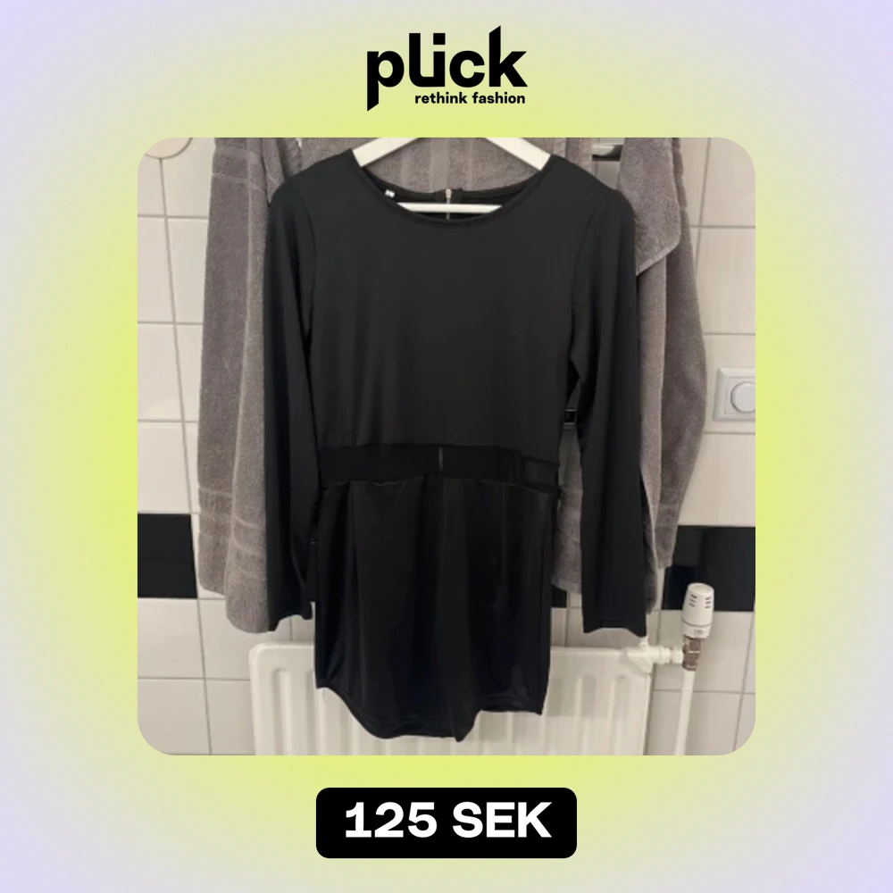 Snygg svart klänning med liten nät-detalj i midjan och lång dragkedja bak. Aldrig använd! Storlek L men skulle säga att den passar S också, den är stretchig