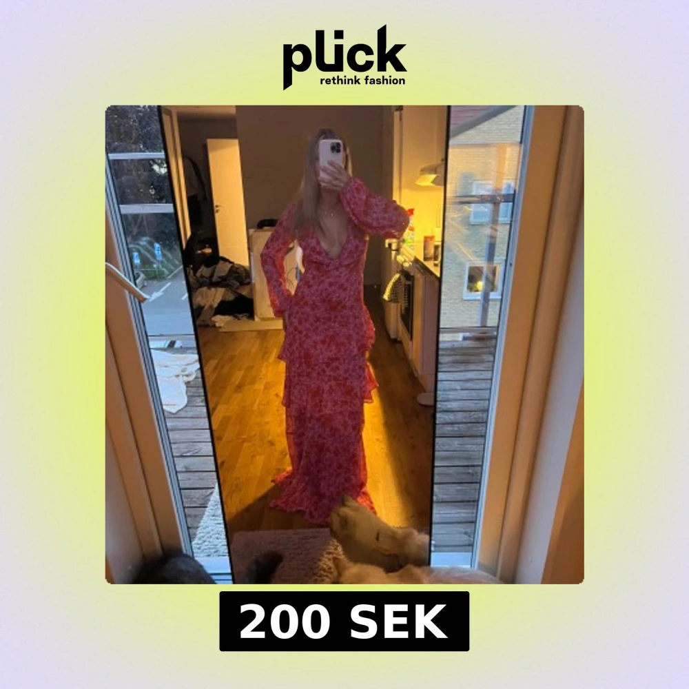 Säljer en superfin långklänning i rosa med blommigt mönster. Klänningen har djup v-ringning, långa ärmar och flera lager volanger nedtill som ger en romantisk vibe. Perfekt för dig som vill sticka ut med en färgglad och flowy look.
