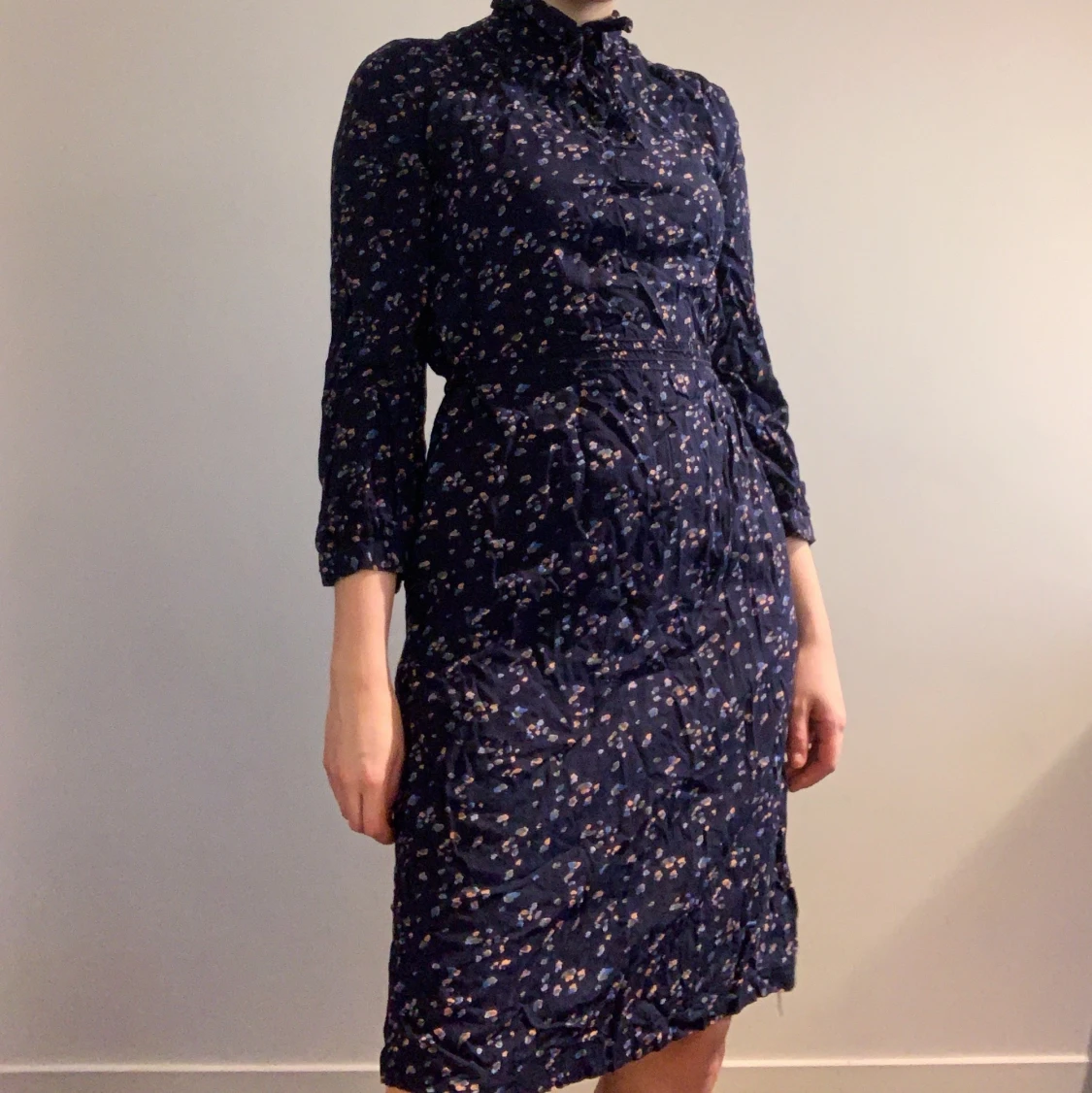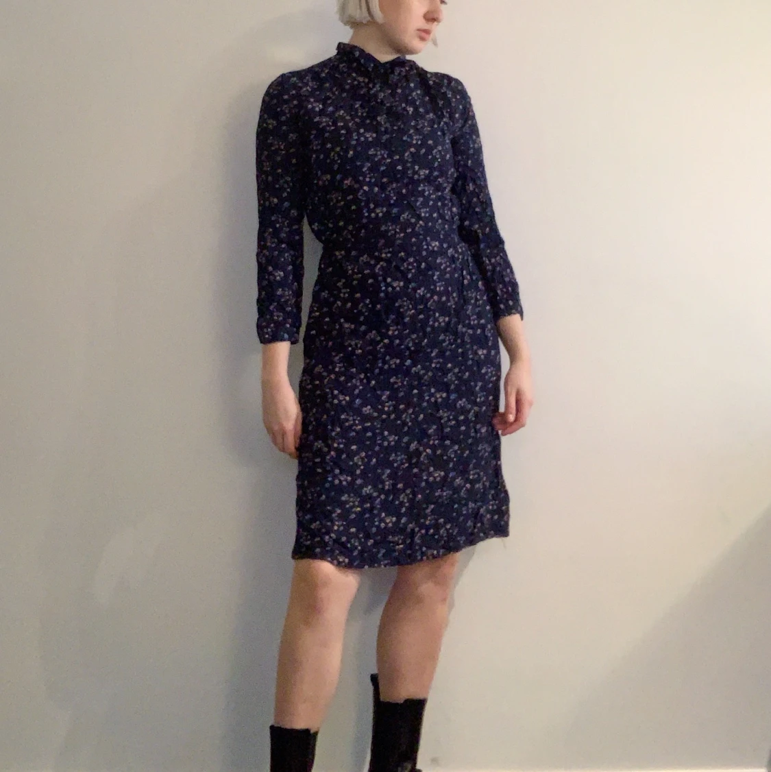 Blåblommig klänning med knytning och knappar i halsen. Vintage. Fickor. Strl 38 men bedömer den vara närmare en 36:a. Frakt 66kr med postnord Skicka Lätt.
