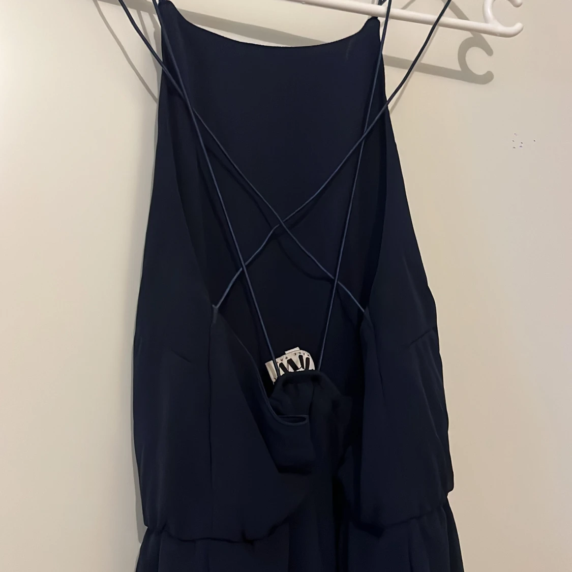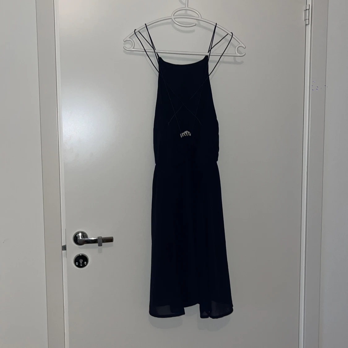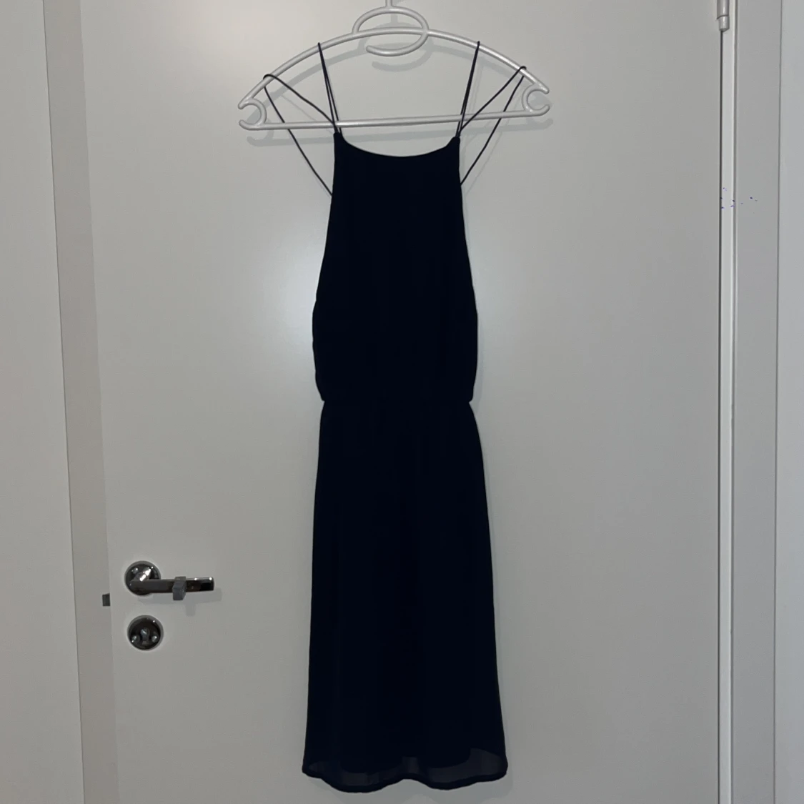 Superfin klänning med svinsnygg rygg i marinblå färg. Resår i midjan. Använd endast fåtal gånger