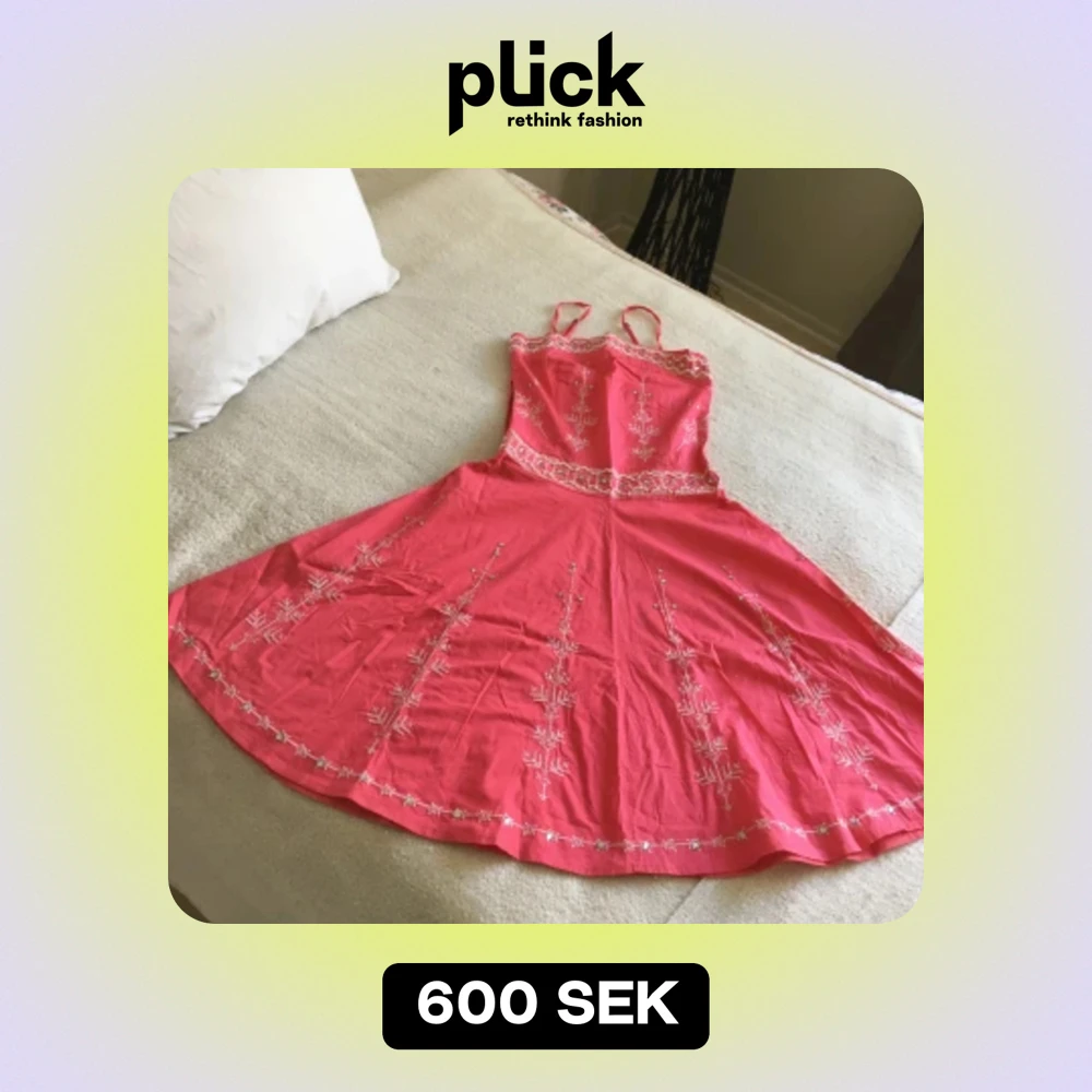 Klänning med detaljer.syds med små pärlor och strass .handgjord.finns sido gylfen.längd på kjolen 52cm .storlek smal .den sitter så fin .har aldrig använd. Fråga. Gärna om ni undrar nåt mer .kan möta er om ni vill tittar närmare på klänning