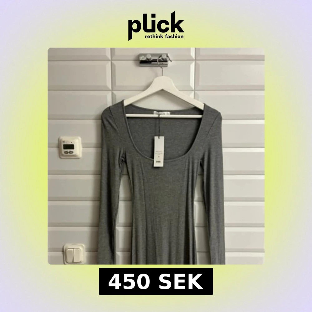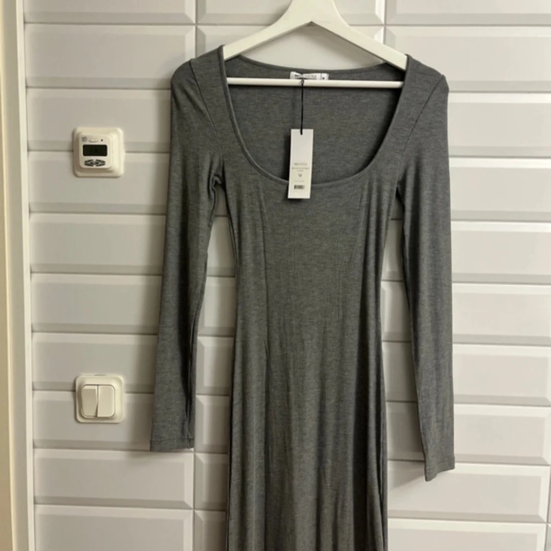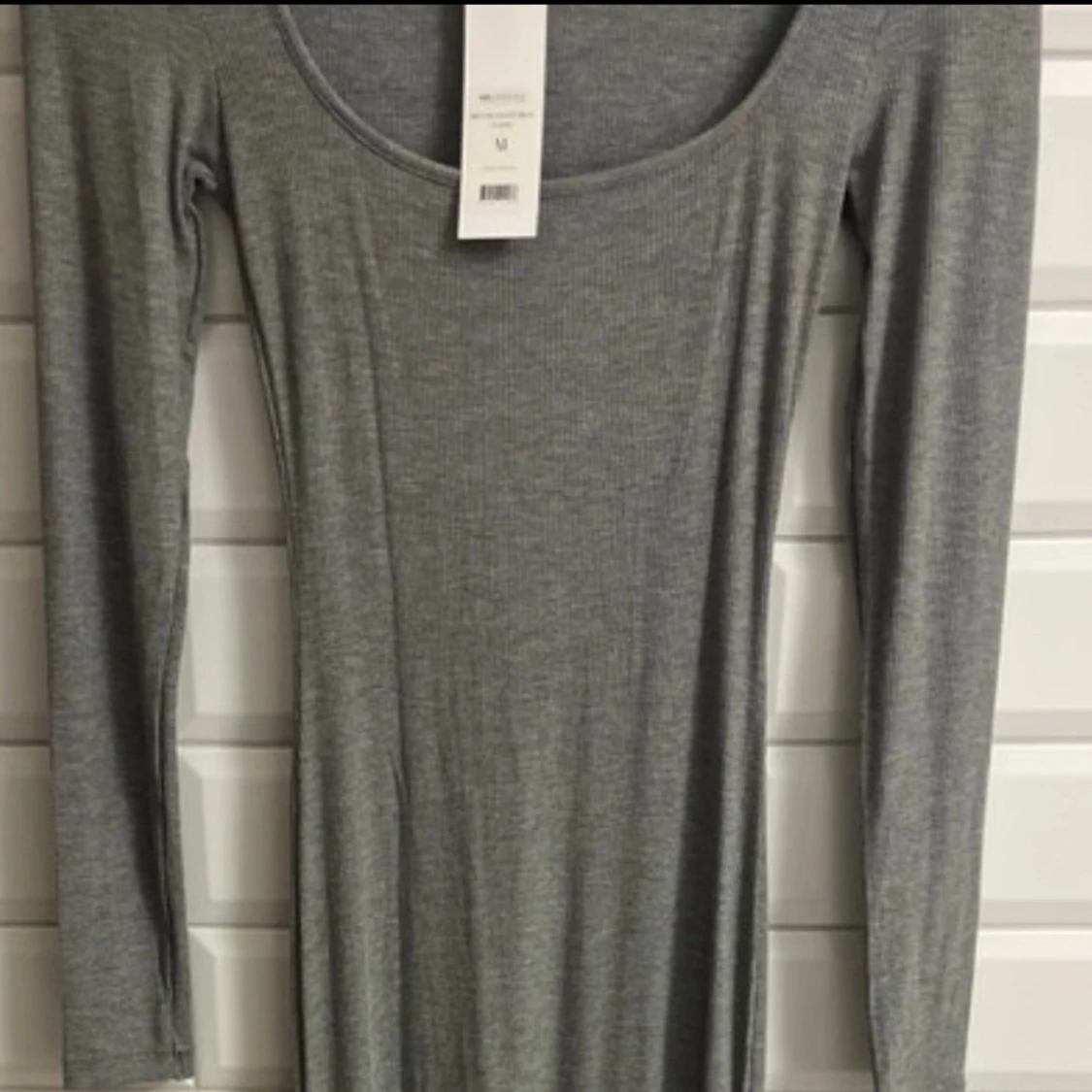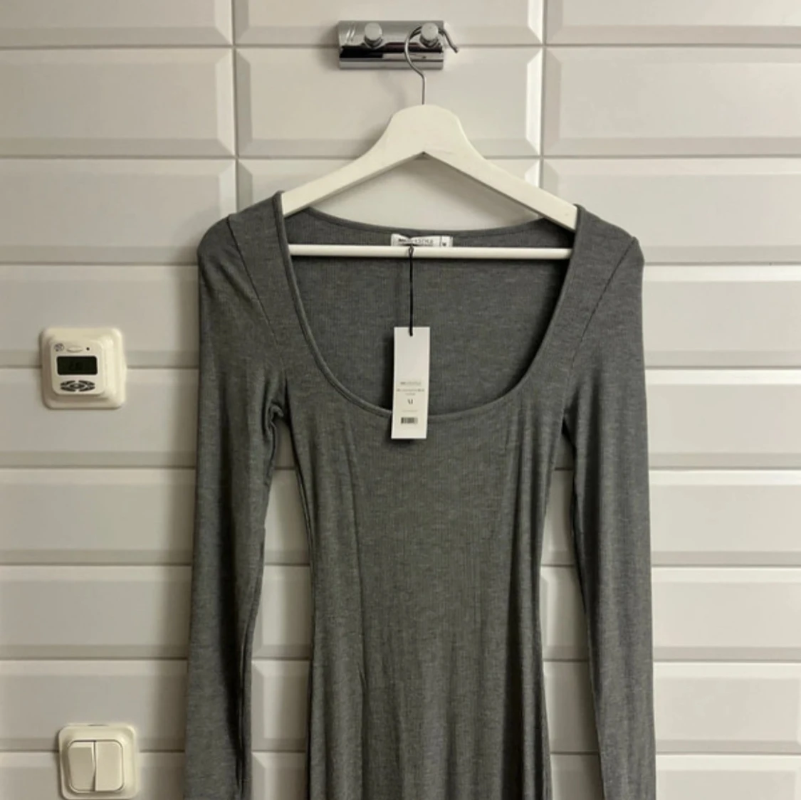 Snygg grå ribbad klänning från MKLIFESTYLE med långa ärmar och en djup rund halsringning. Perfekt för en stilren look. Aldrig använd eller testad. Köpt från MKLIFESTYLE. Säljer för 450.