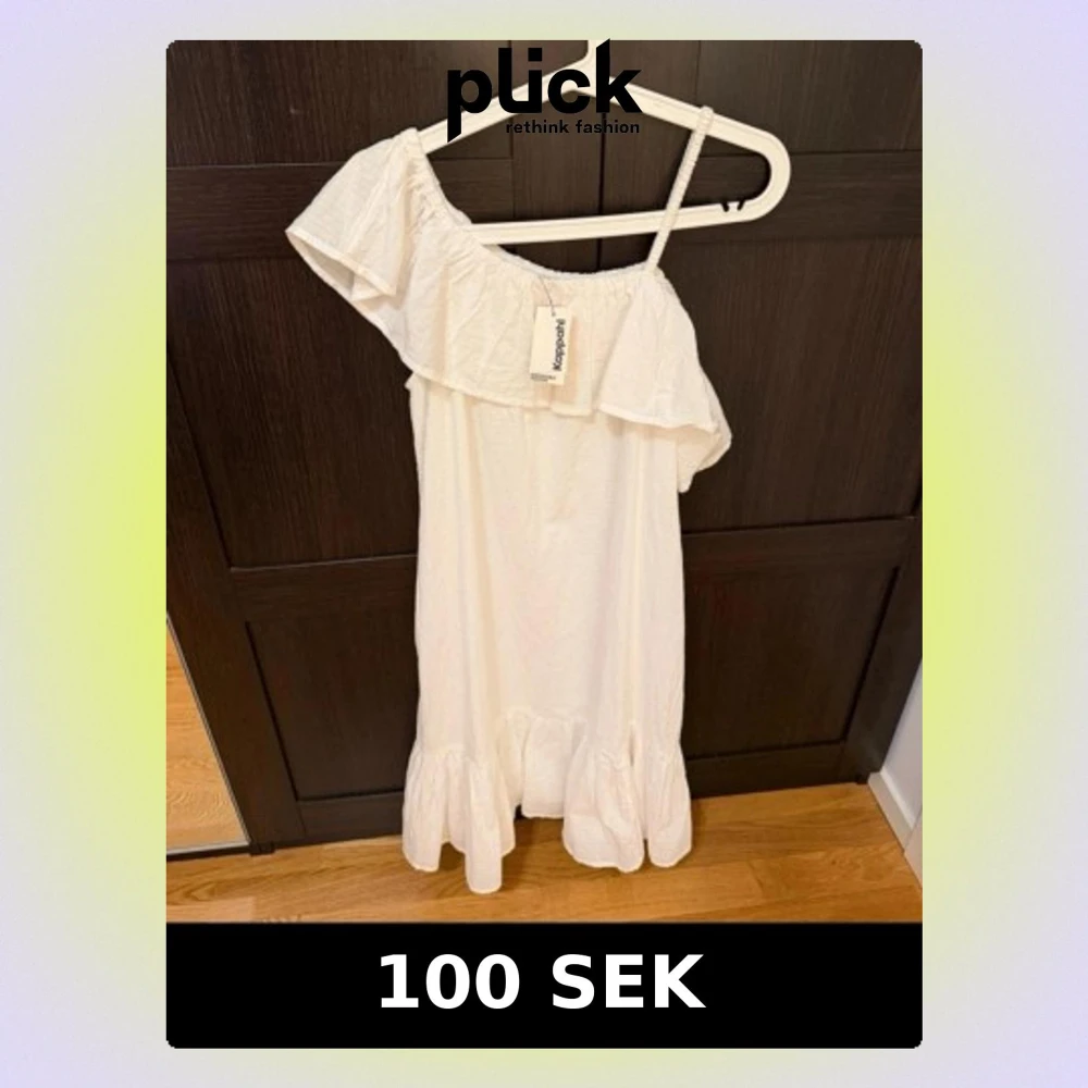 Söt vit klänning med volangdetaljer och en axelbandslös design på ena sidan. Klänningen har en luftig passform och är perfekt för varma dagar. Tillverkad i ett lätt bomullsmaterial och har en kort längd med volang nertill.