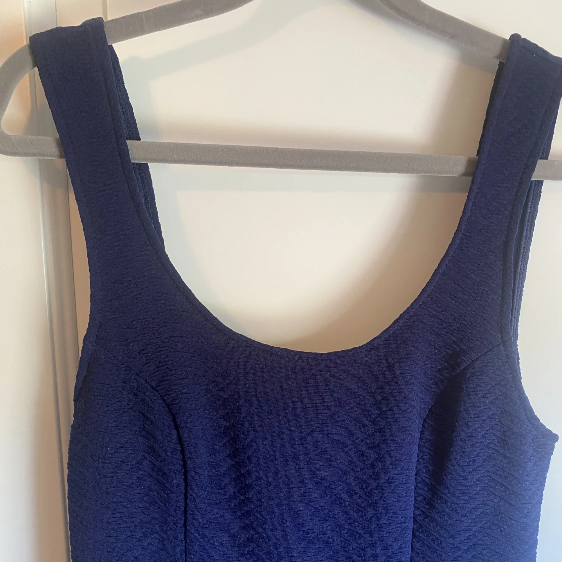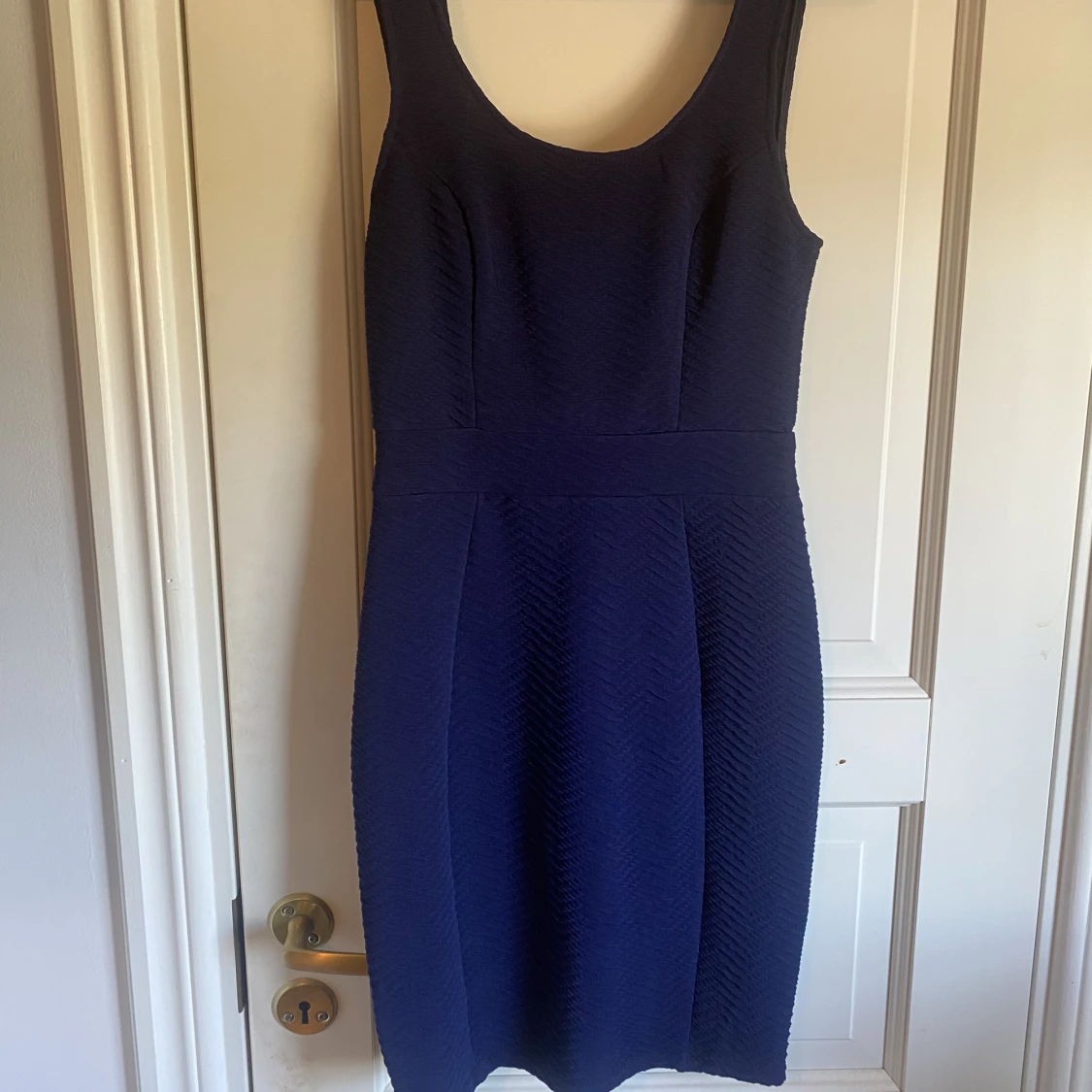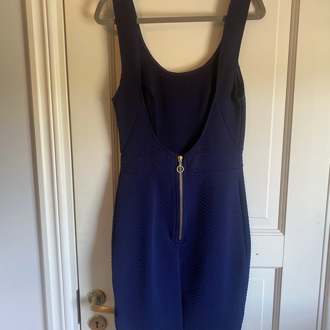 Mörkblå klänning med djup rygg från Nelly. Använd vid ett tillfälle. Storlek S.