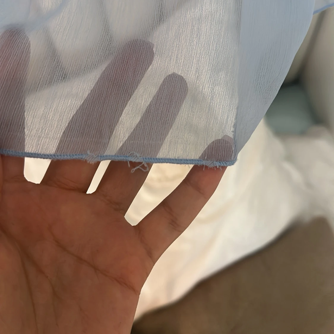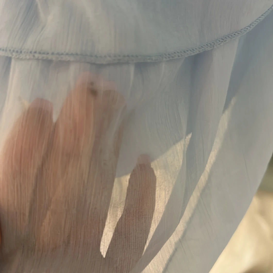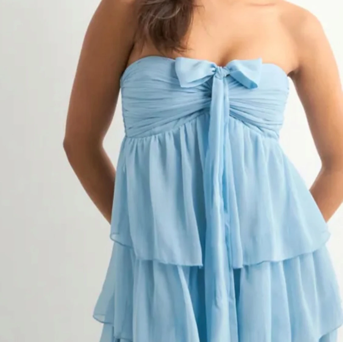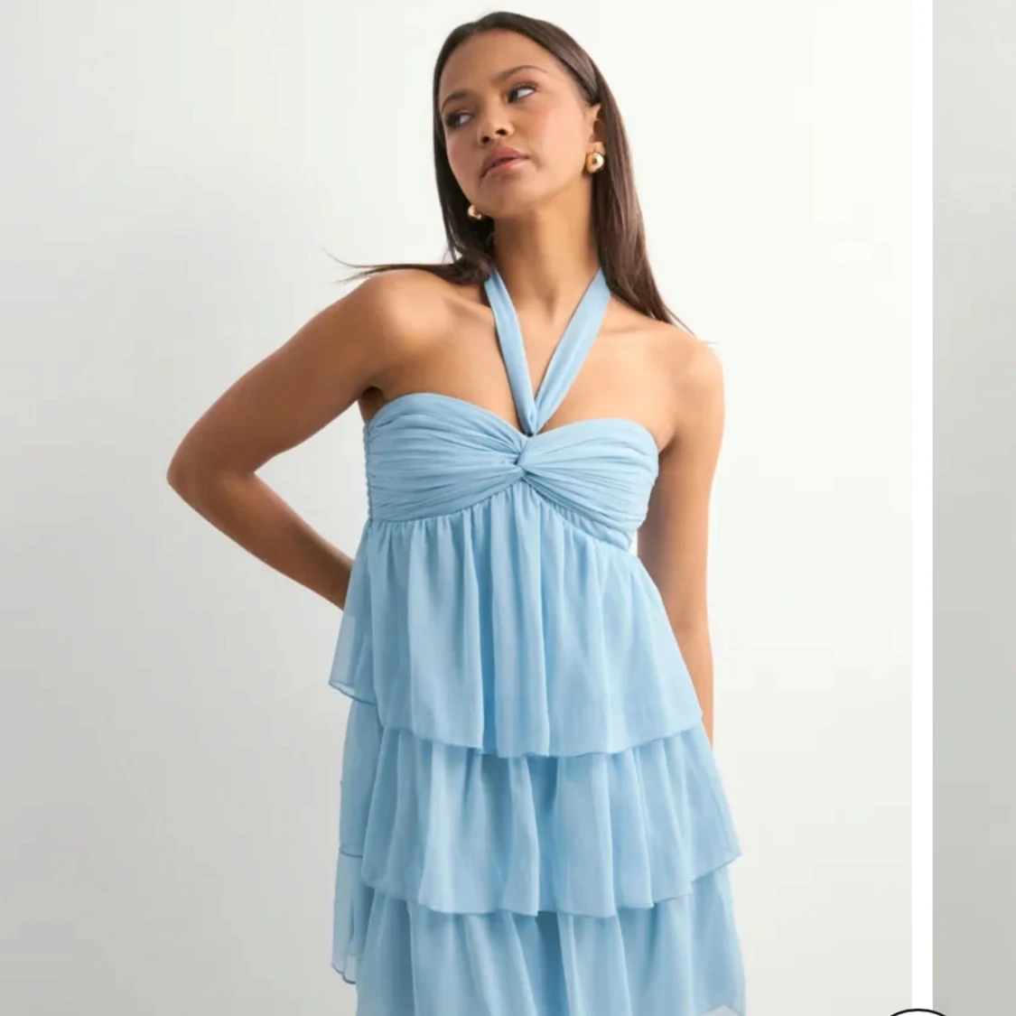 Supersöt ljusblå kortklänning med flera lager volanger och omlottband som kan knytas både runt halsen och som rosett framtill. Klänningen är axelbandslös och har ett skirt, lätt material som ger en flowy känsla. Perfekt för sommarens alla tillfällen! Det finns en liten fläck som inte syns vid användning och en tråd som inte syns. Skriv för mer bilder.