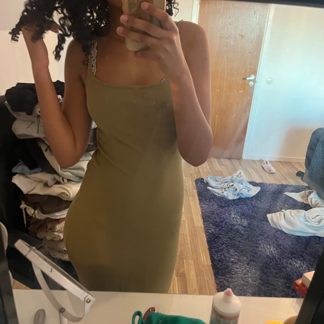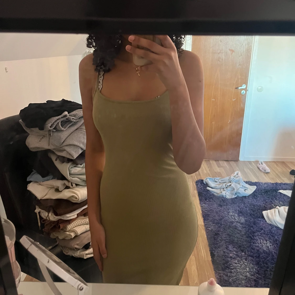 Säljer en stilren olivgrön klänning med tight passform. Klänningen är ärmlös och har en enkel design som framhäver figuren. Perfekt för en somrig dag eller en kväll ute.