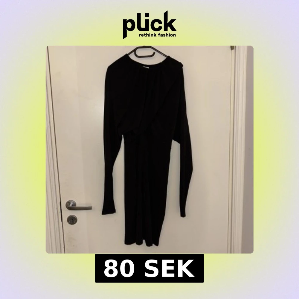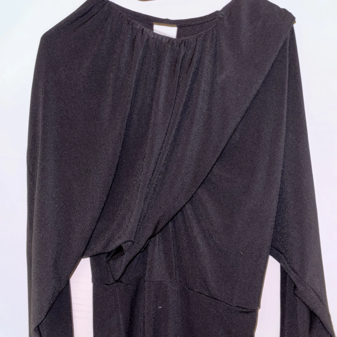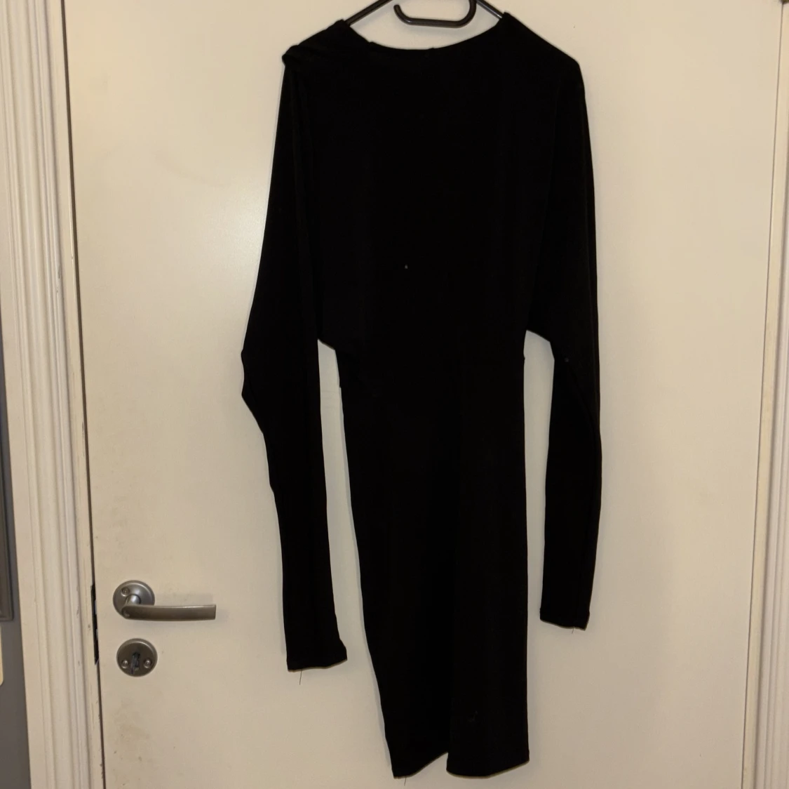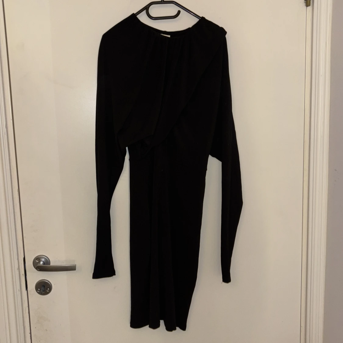 Elegant svart klänning med lång ärm och asymmetrisk design. Perfekt för en stilren look.