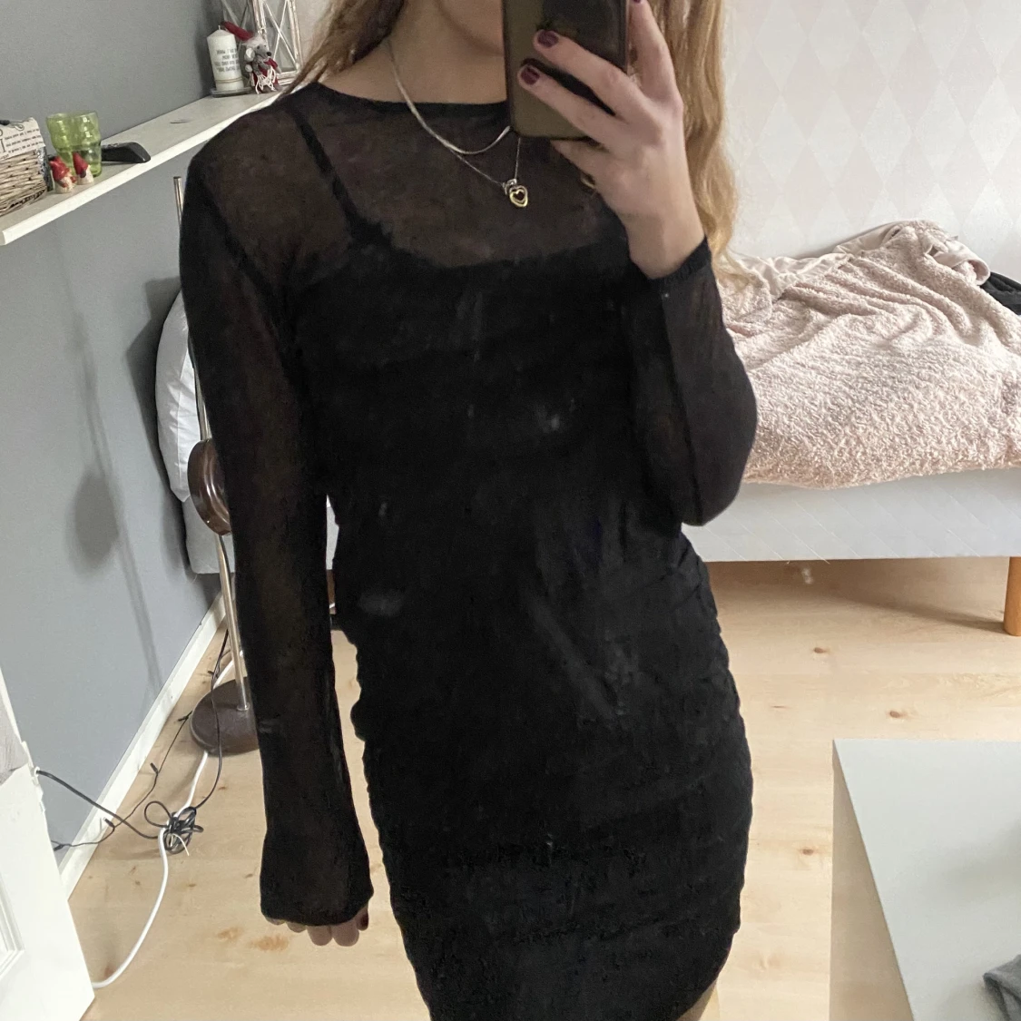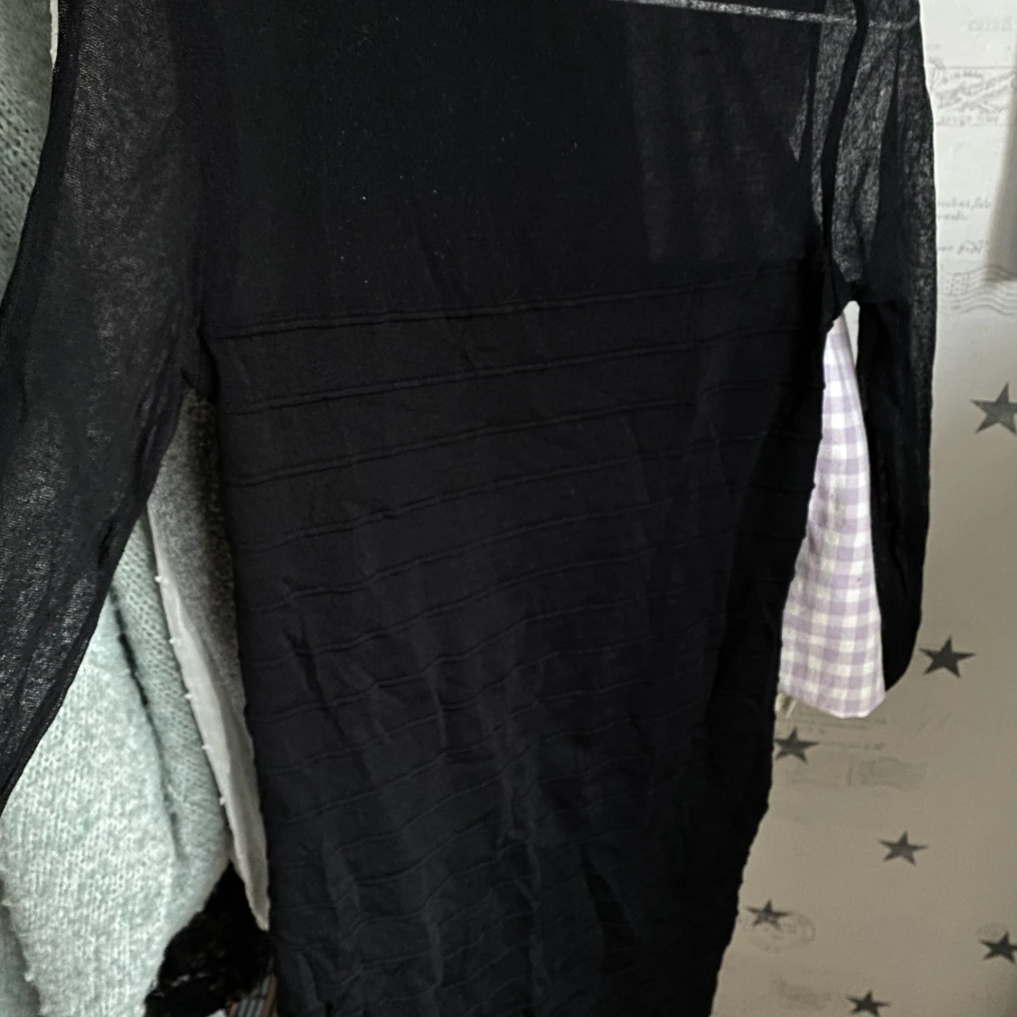 Svart klänning med ”ränder”, mesh-tyg högst upp samt vid armarna. Vet inte vart den kommer ifrån då jag ärvt den, bra skick!