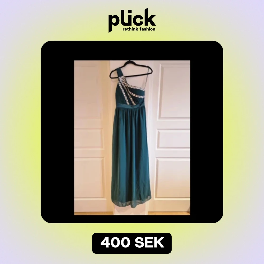 Fin mörkgrön one shoulder aftonklänning med fina dekorativa stenar på överdelen. Använd 1 gång.
