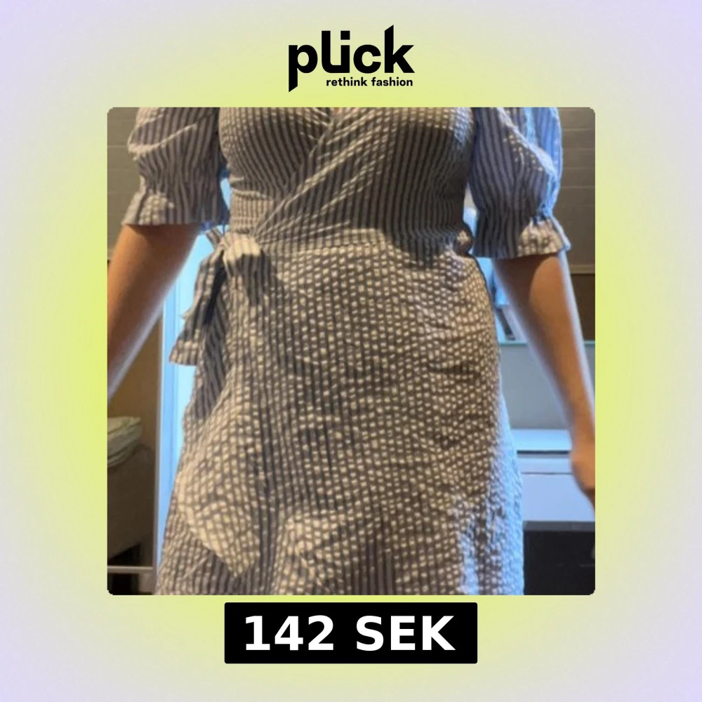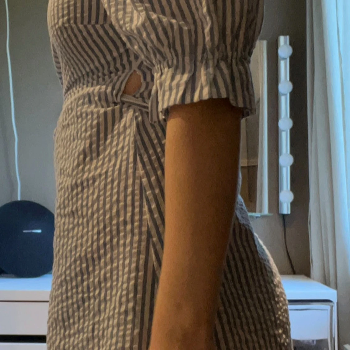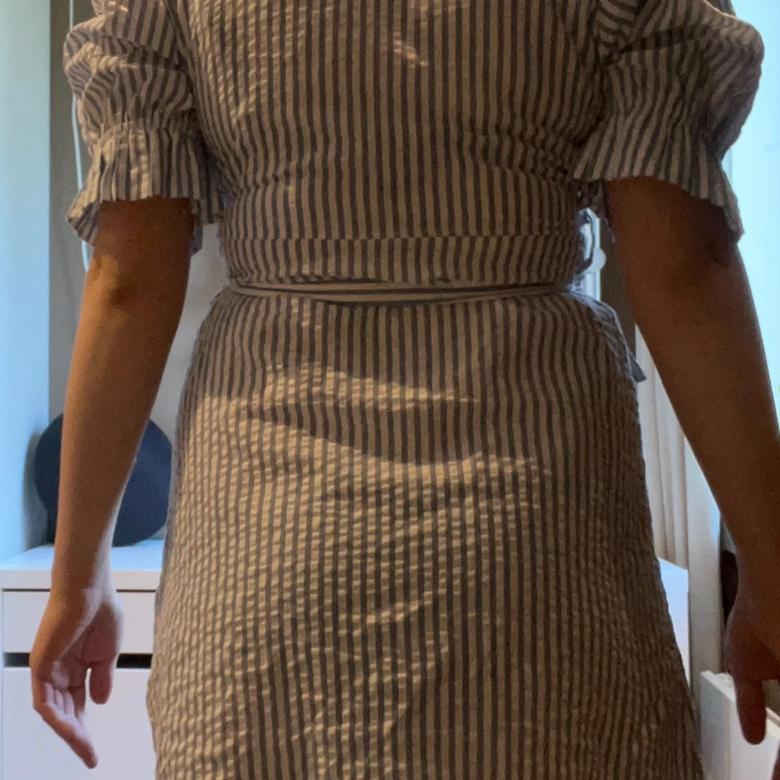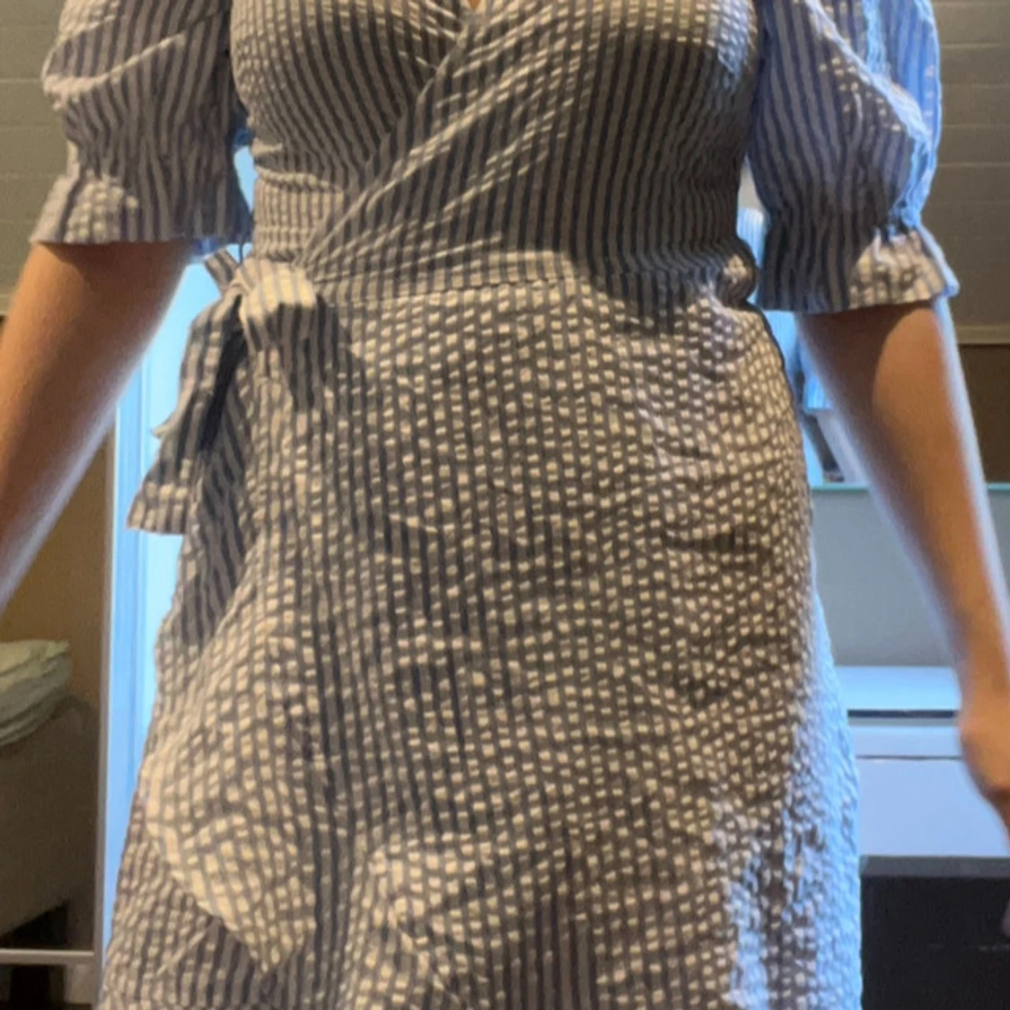 Superfin kort omlottklänning med blåvita ränder och puffärmar. Klänningen har knyt i midjan och v-ringad hals. Tillverkad i ett lätt bomullstyg som känns perfekt för varmare dagar. Snygg passform och trendig look!