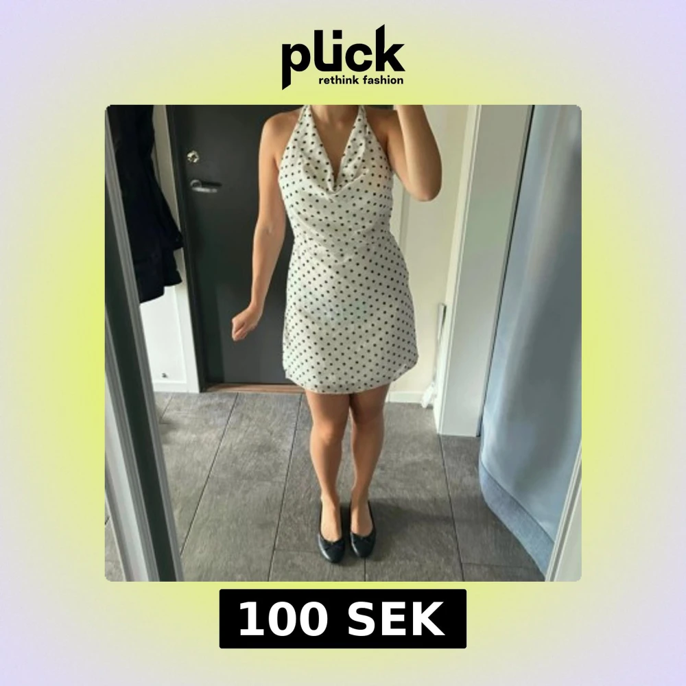 Supersöt kort vit klänning med prickar och halterneck. Klänningen har öppen rygg och knyts i nacken. Aldrig använd💕
