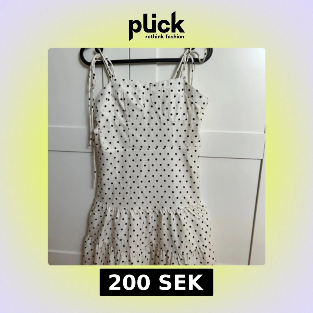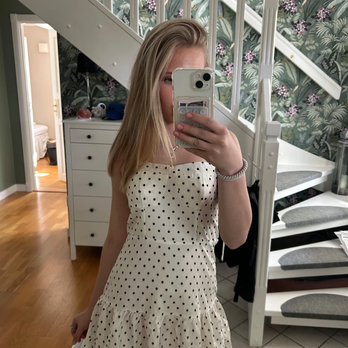 Söt vit klänning med svarta prickar och volang nertill. Axelbandsmodell med knytbara axelband och figurnära passform upptill. Perfekt för sommarens alla tillfällen!