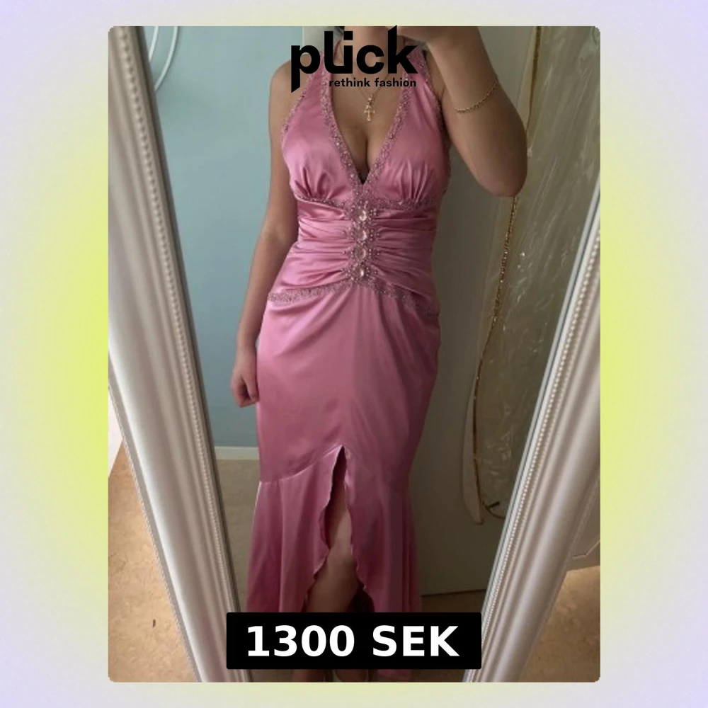 Säljer en glansig rosa långklänning köpt i butik med djup v-ringning, smala axelband och dekorativa pärlor framtill. Klänningen har slits framtill och markerad midja. Perfekt för bal, bröllop och fest. Pris dissktuerbart vid snabb affär! Finns en kort underkjol som slutar precis vid slitsen. Använts endast en gång! Funkar som xs-s Jag är 167 och klänningen slutar precis vid marken med klack. Pris är disskuterbart vid snabba affärer!