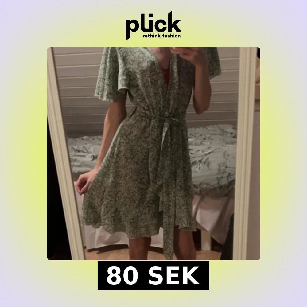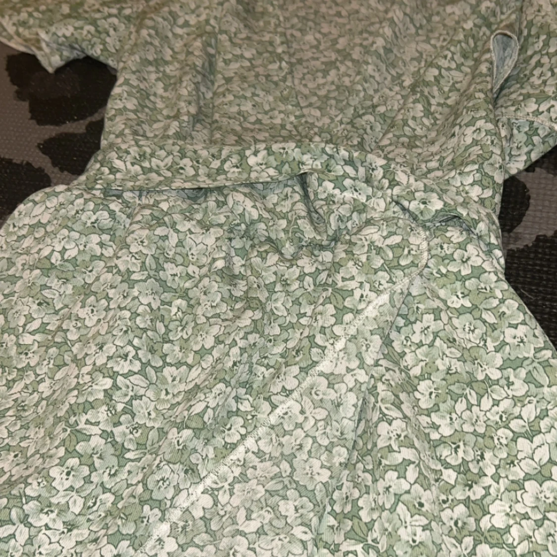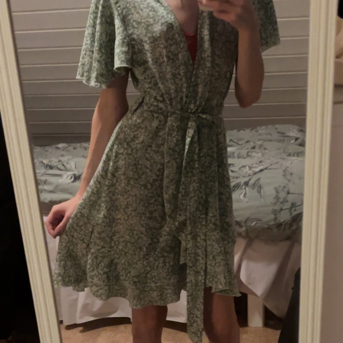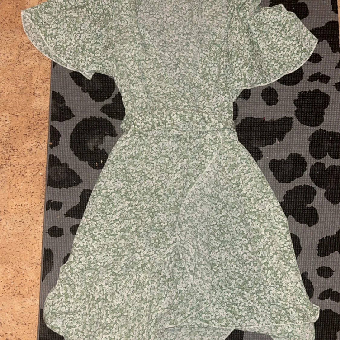 Supersöt grön kort omlottklänning med vitt blommönster och knyt i midjan. Klänningen har v-ringning, volangiga korta ärmar och luftig passform. Perfekt för varma dagar och ger en fräsch och somrig vibe.