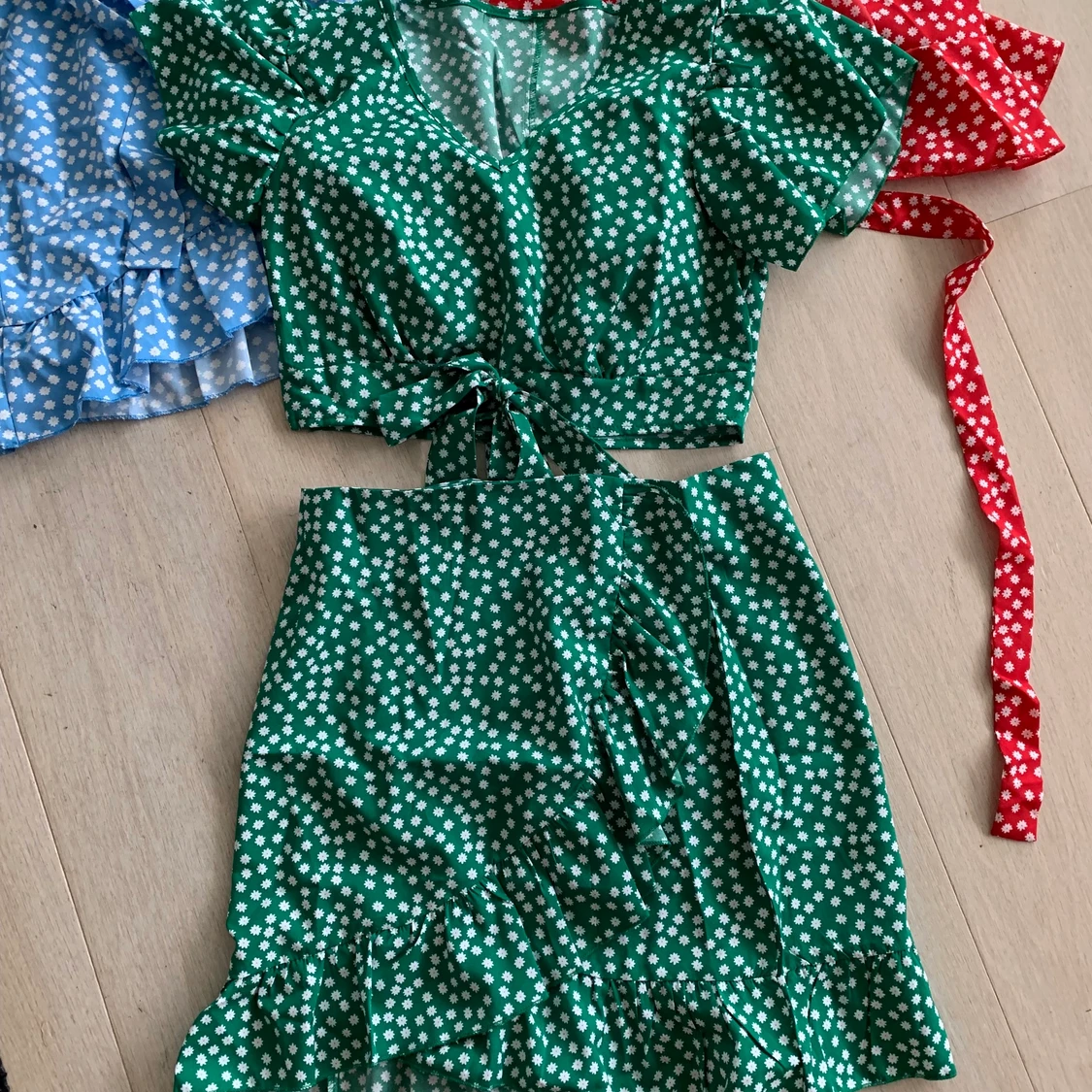 3 fina set från Shein i small. Två det med kjol och topp samt en jättesöt omlottklänning. Inte använda. Säljer i paket med alla för 150kr. Kan sändas.