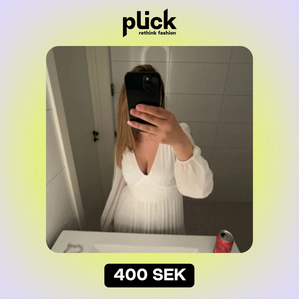 En elegant vit klänning med långa ärmar och v-ringad hals. Klänningen har en åtsittande midja och en plisserad kjol som ger en luftig känsla. Materialet ser ut att vara lätt och flödande, vilket gör den perfekt för både formella och semi-formella tillfällen. *Skrivet av AI, men skulle faktist vilja hålla med. Använd en gång, och det var under min guddotters namngivning. Nypris 879:- från bubbelroom. Fler bilder finns att få, hör av dig vid intresse🤠😍