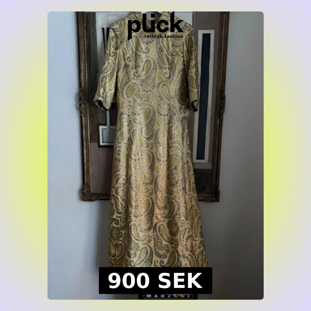 Unik guld långklänning med paisleymönster i guld och blå inslag.. Klänningen har hög krage, halvlånga ärmar och en elegant, utsvängd siluett. Materialet känns lyxigt och skimrande, perfekt för dig som vill sticka ut. Storleken uppskattas till en 40/42