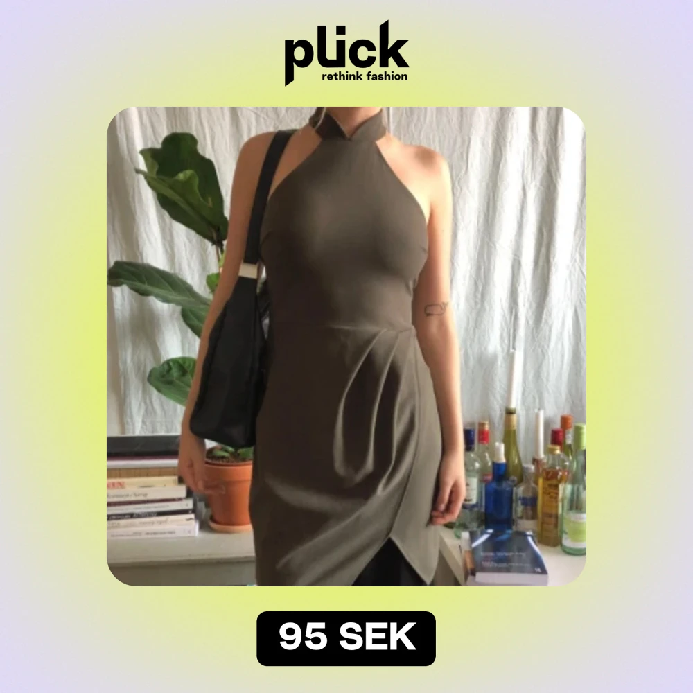 Halterneck klänning i olivgrön färg. Öppen rygg och liten slits på framsidan. Storlek uppskattas till S