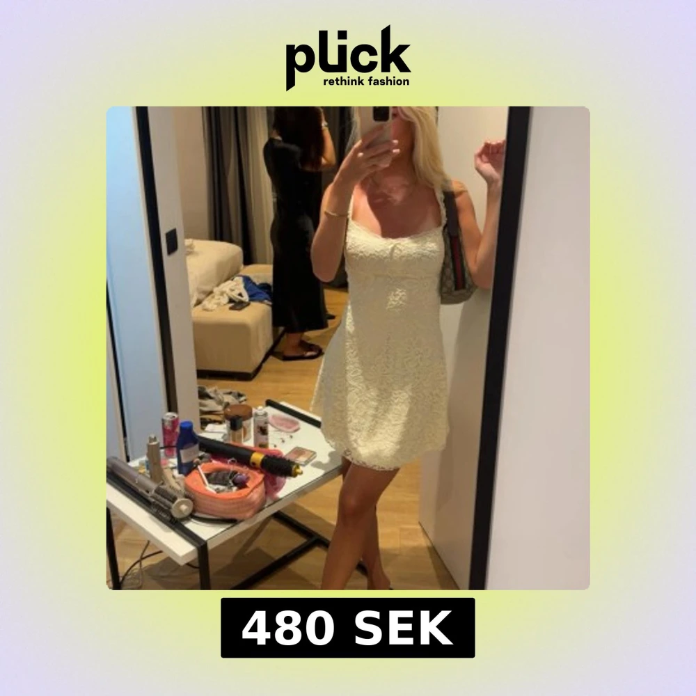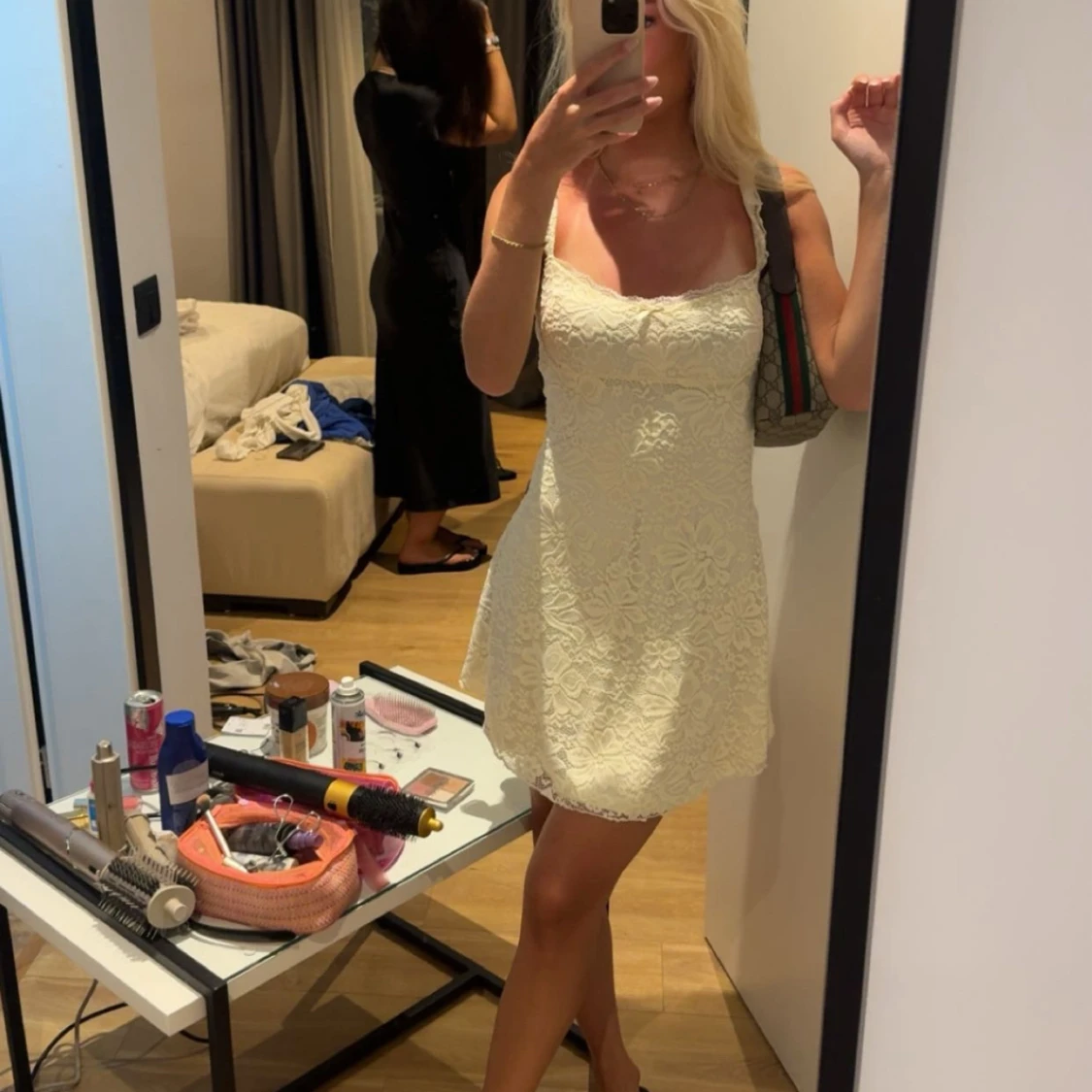 Supersöt gul/vit kort klänning med spetsdetaljer och smala axelband. Storlek S. Använd en gång. Från princess polly