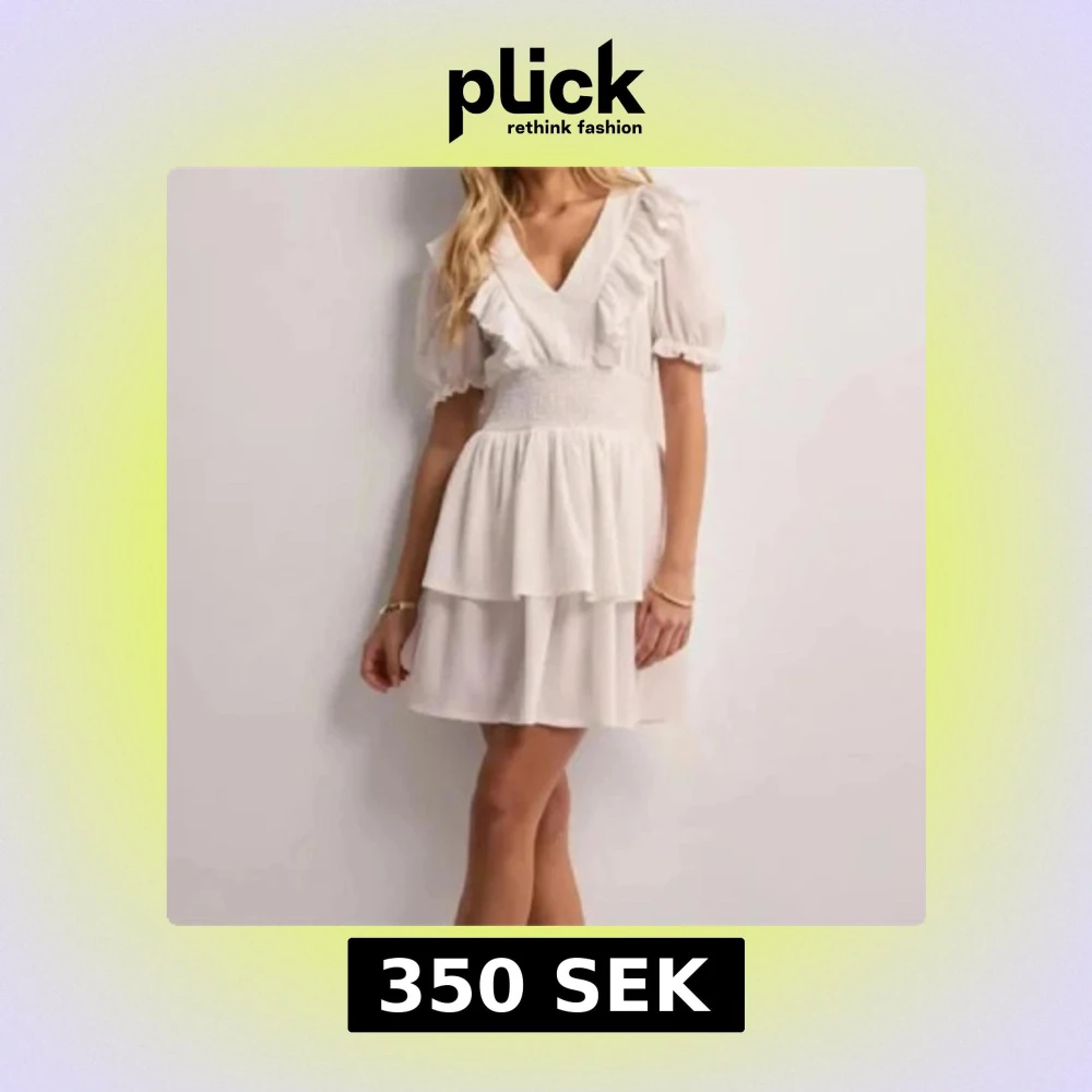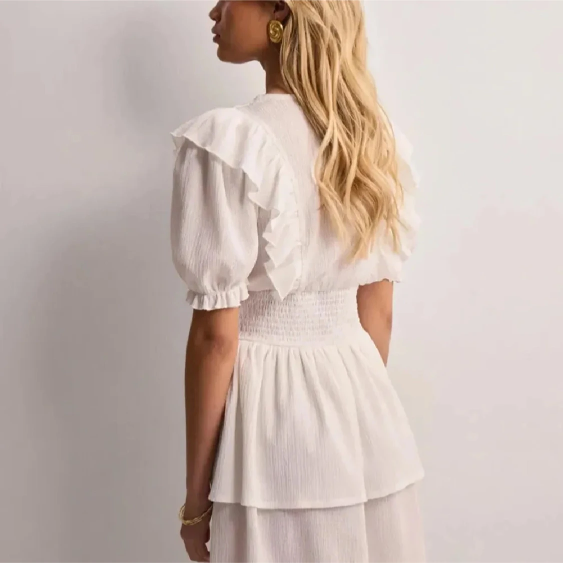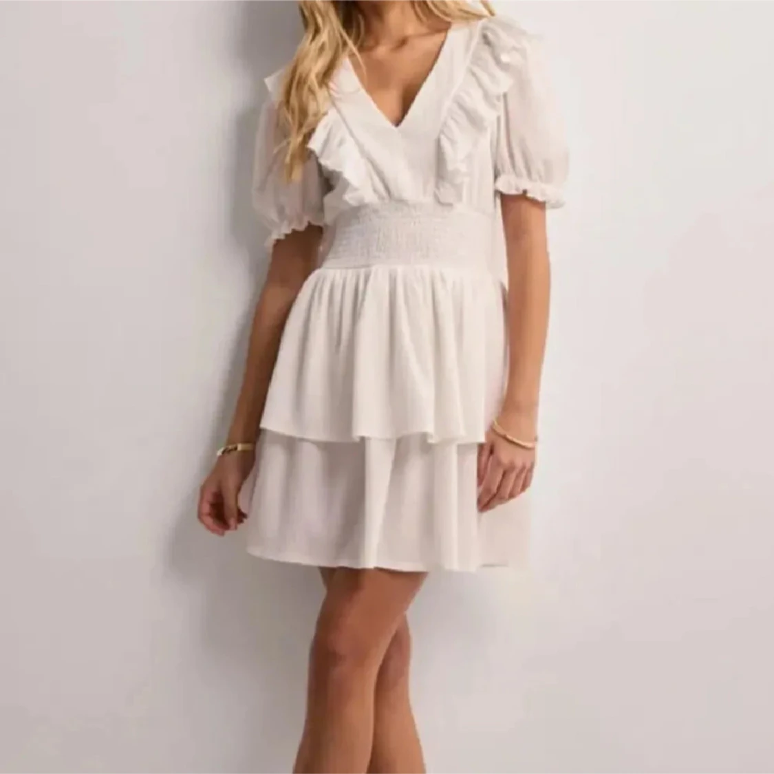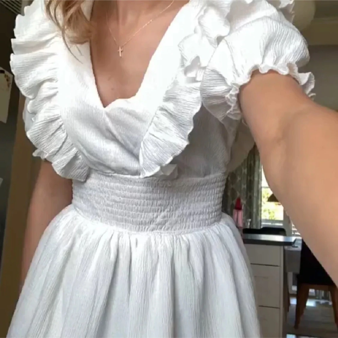 Superfin vit kortklänning med v-ringning, volangdetaljer och puffärmar. Smockad midja som ger en snygg siluett och dubbla lager i kjolen för extra volym. SKICKAR EGNA BILDER VID INTRESSE! går att förhandla pris❤️kommer inte till användning , aldrig använd