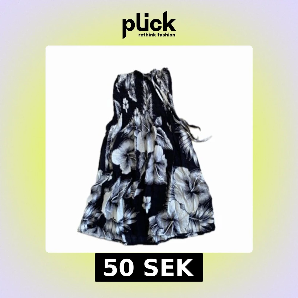 En svart och vit blommig klänning med snörning runt nacken jag köpte i Grekland för ett par år sedan. Passar nog en 10-12 åring. Bra kvalitet och i fint skick⭐️⭐️⭐️ Vet inte om något märke då det inte finns någon lapp.