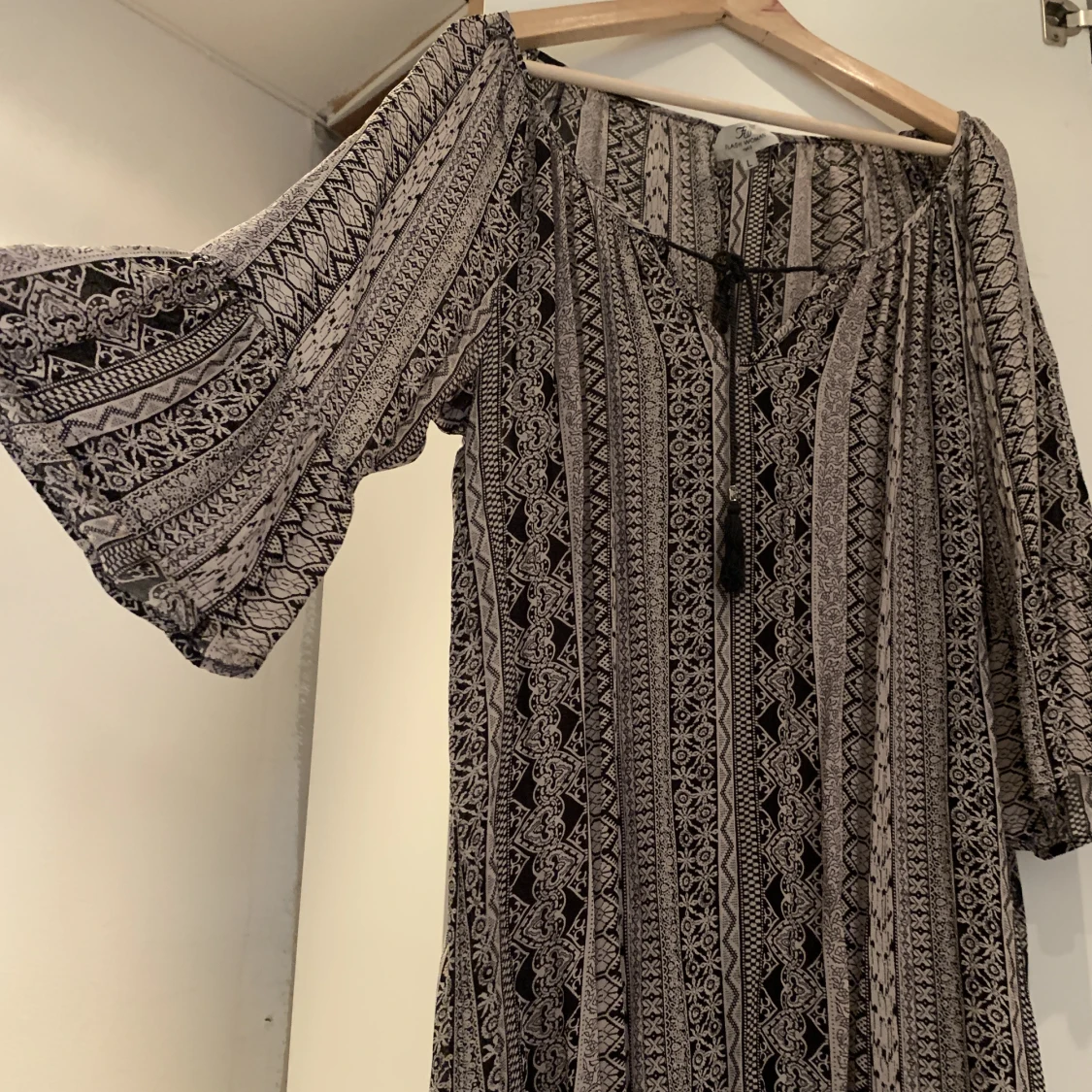 Fin klänning med mönster och tassel vid knytningen. Skärpet kommer ej med.💕står storlek L men passar mer S/M om man ska ha det som en klänning. Köpt second hand så vet ej märket