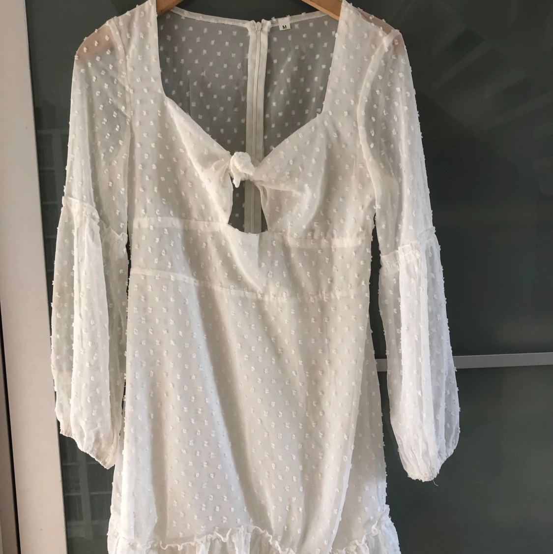 Säljer min fantastiska studentklänning. Endast använd en gång och är som ny. Den går att knyta fram och har dragkedja bak. Den går till mitten av låren har har långa armar och små fina prickar på sig.