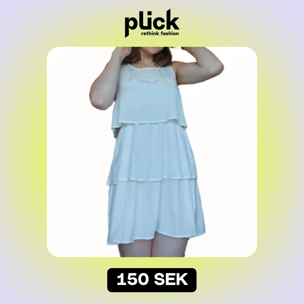 En jättefin vit klänning med tre "volangdelar". Passar perfekt under sommaren eller till studenten och skolavslutningar. Dragkedja finns i nacken. Använd två gånger. Märke: Size&Needle Storlek: S