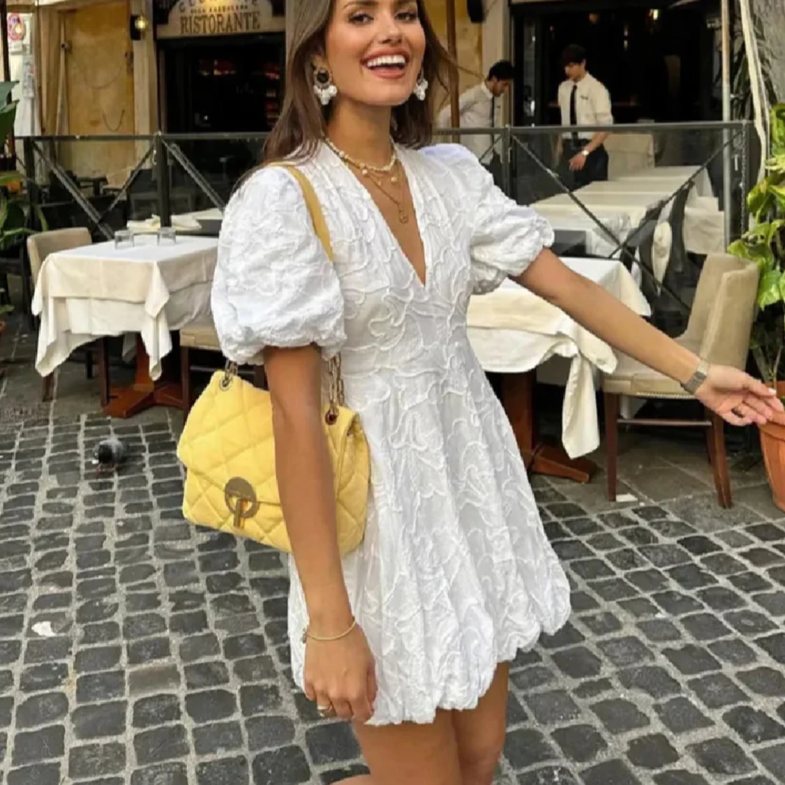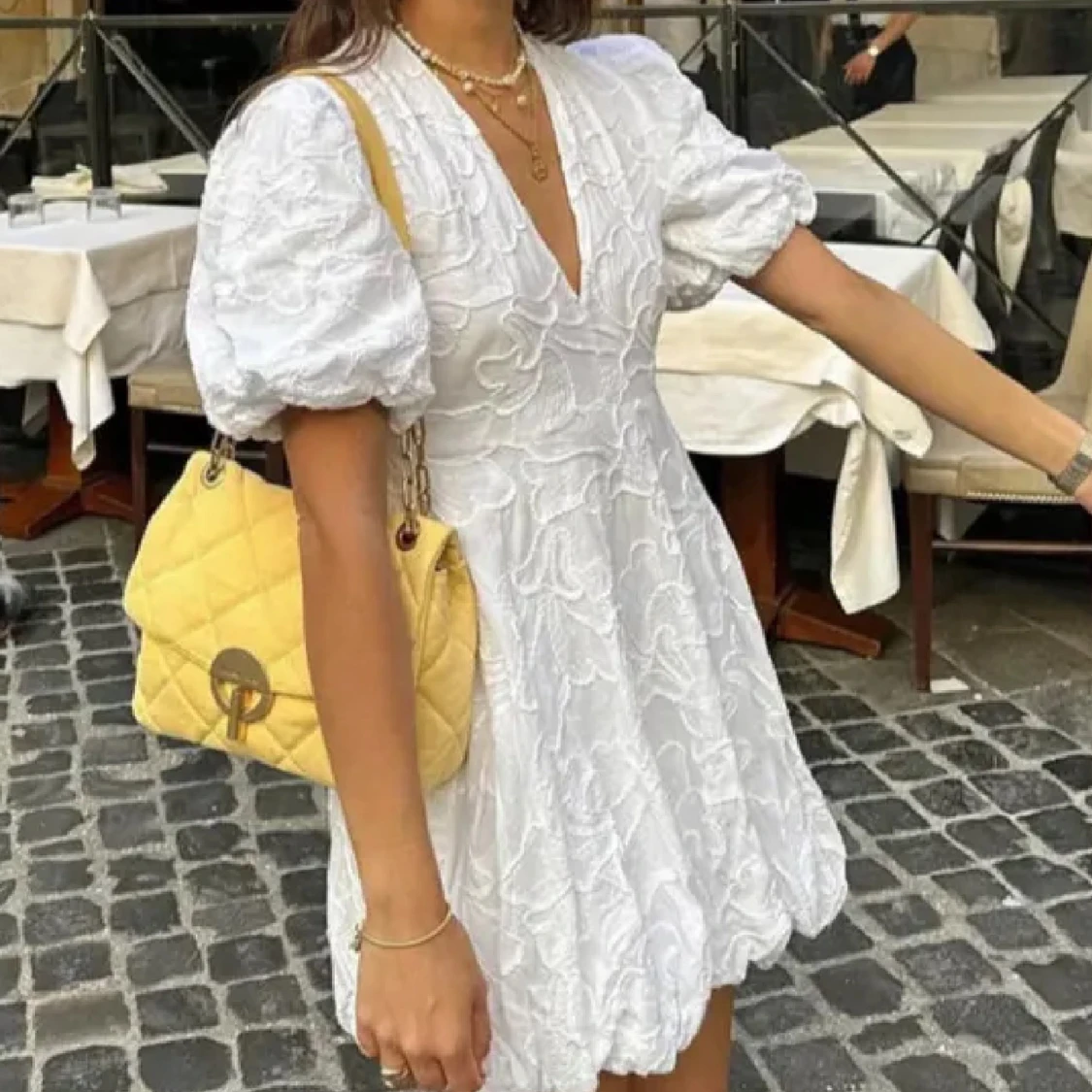 Säljer en söt vit klänning med puffiga kortärmar och v-ringning. Klänningen har ett fint broderat mönster Perfekt för studenten
