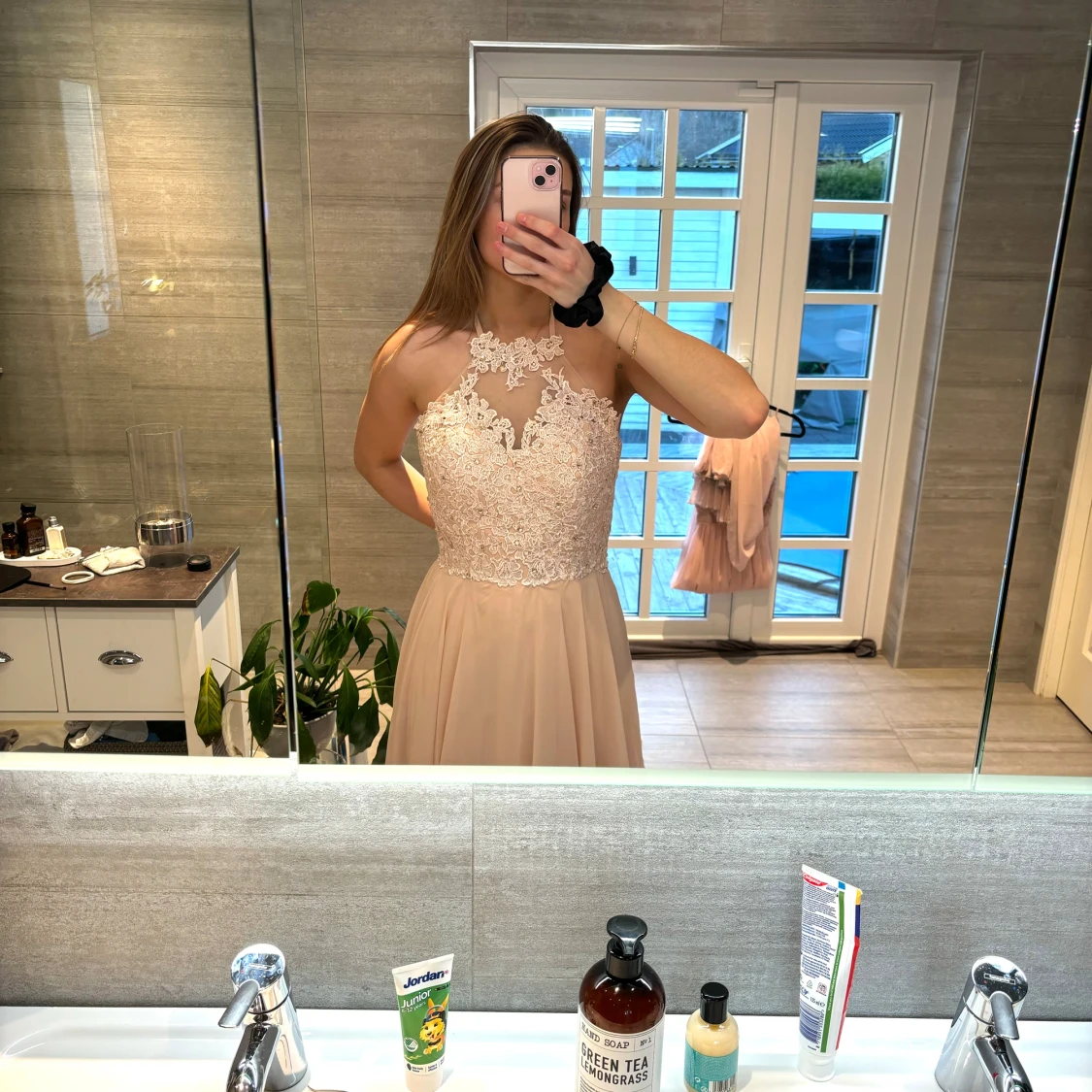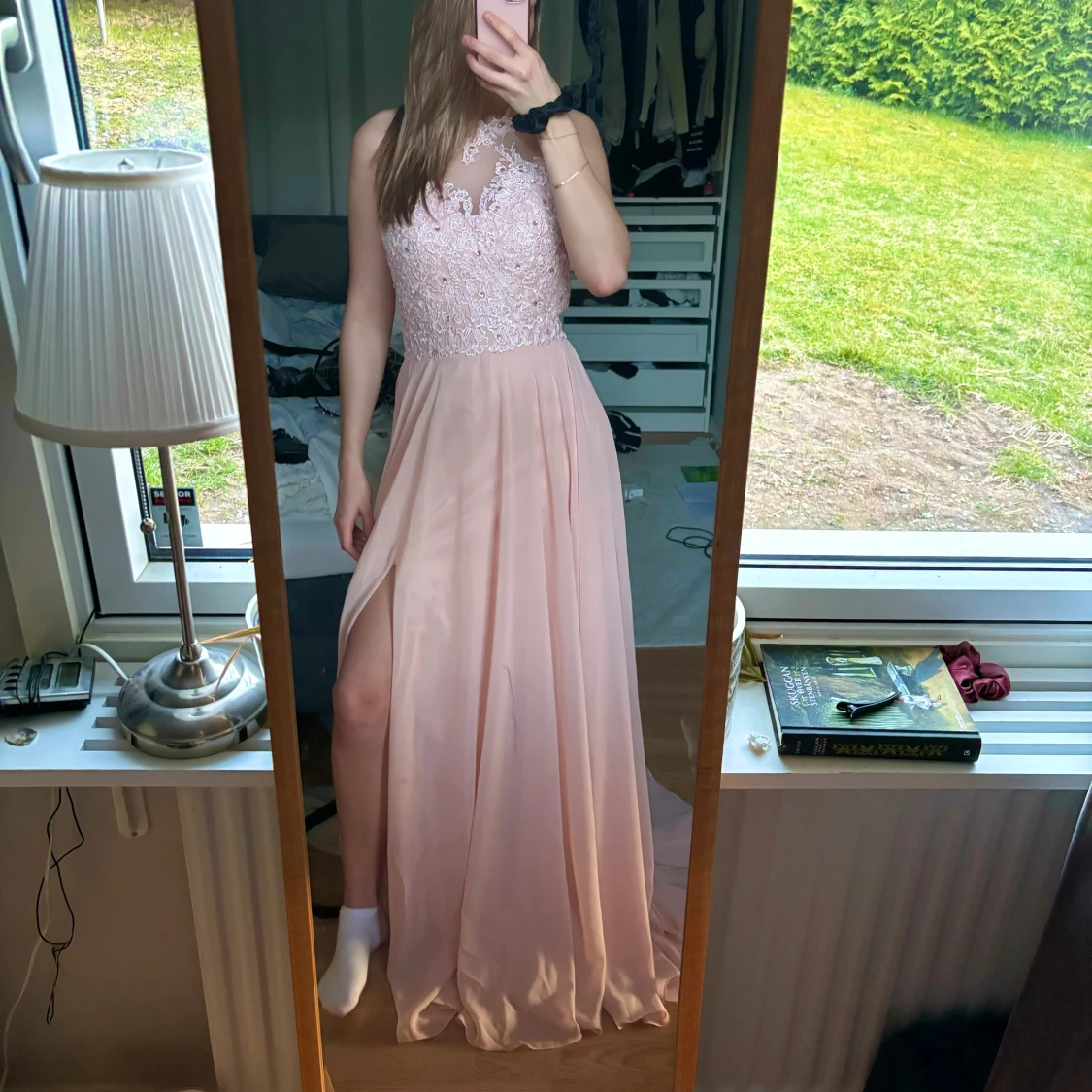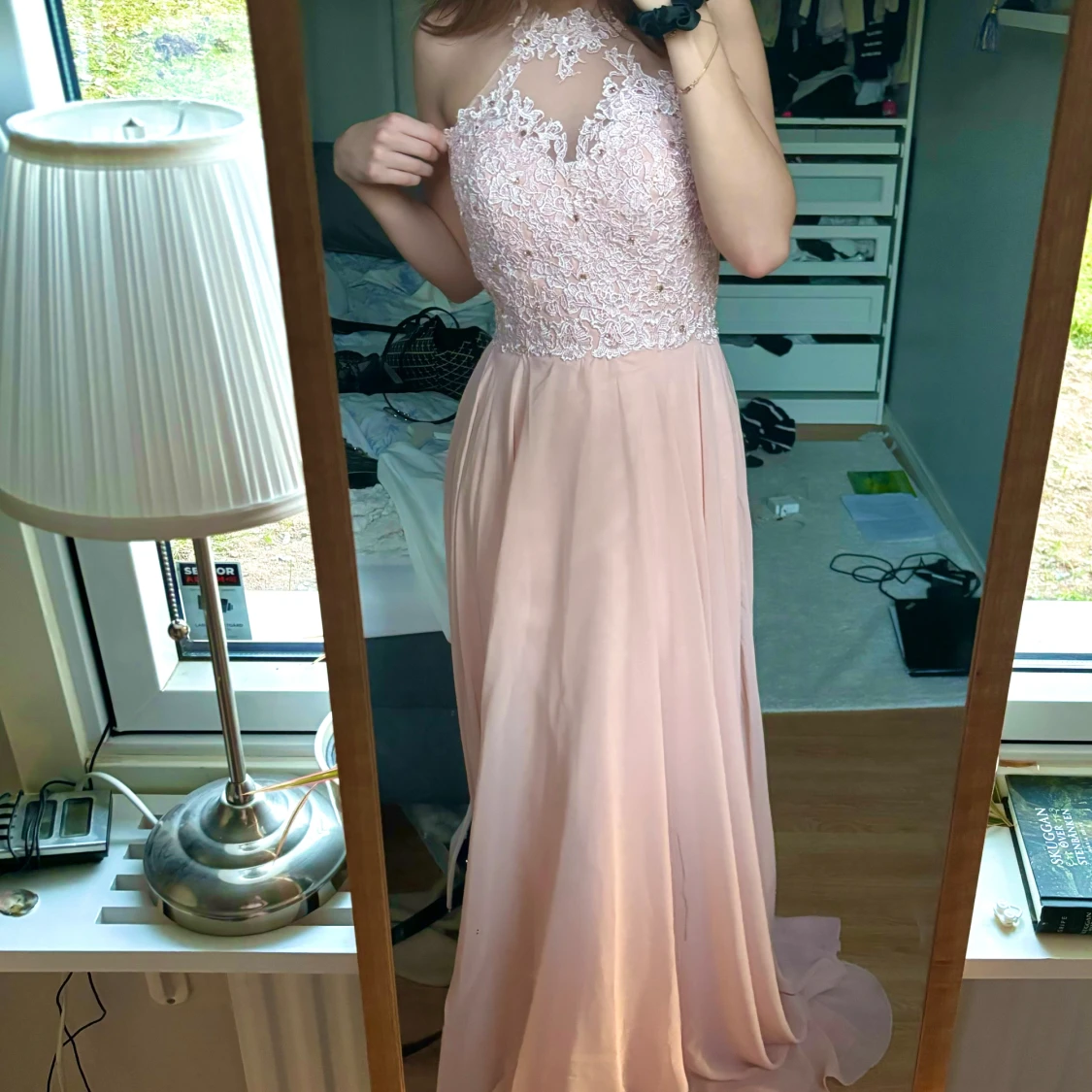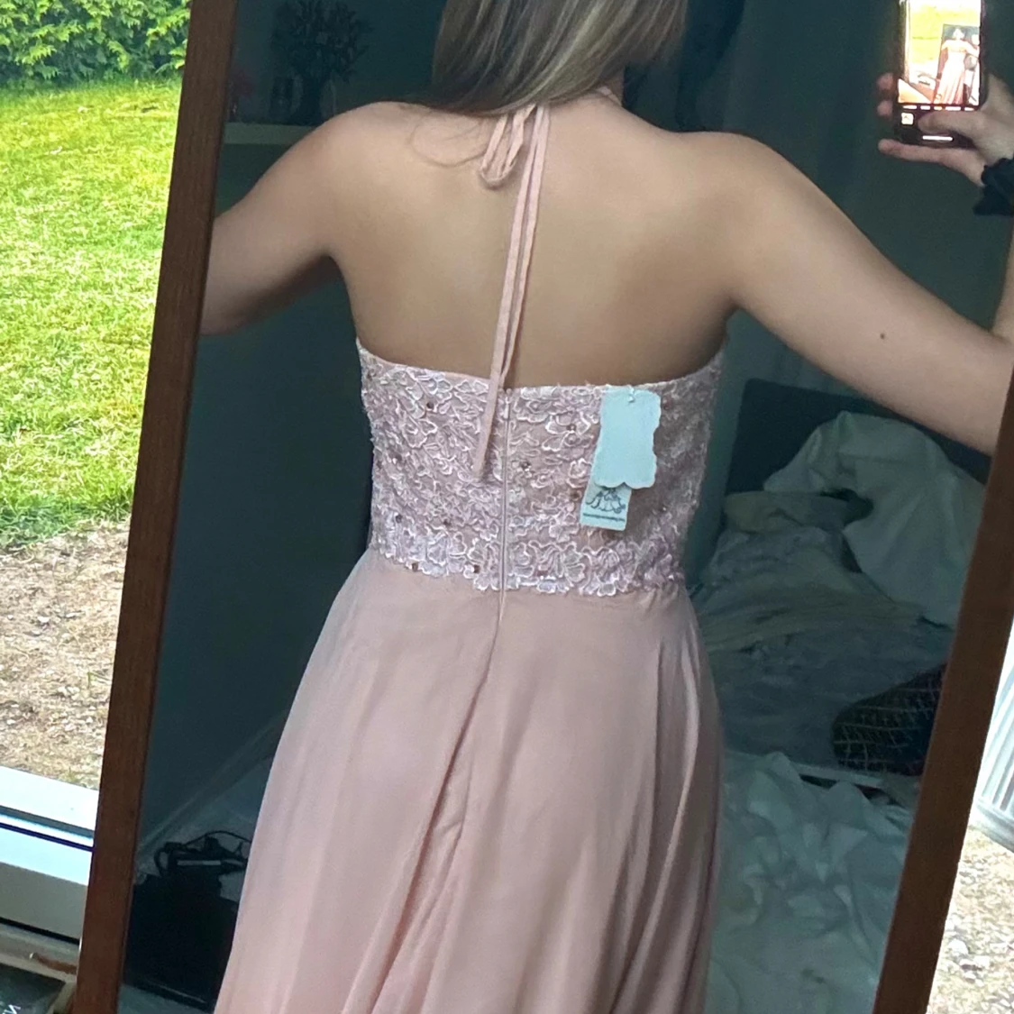 Balklänning som jag tyvärr aldrig hann använda då den kom dagen efter min bal. lappen kvar, nypris 1500kr. Är vanligtvis S och denna är som en M skulle jag säga, är 170 och den är väldigt lång på mig, går att fixa storlek och längd hos skräddare🙌🏼