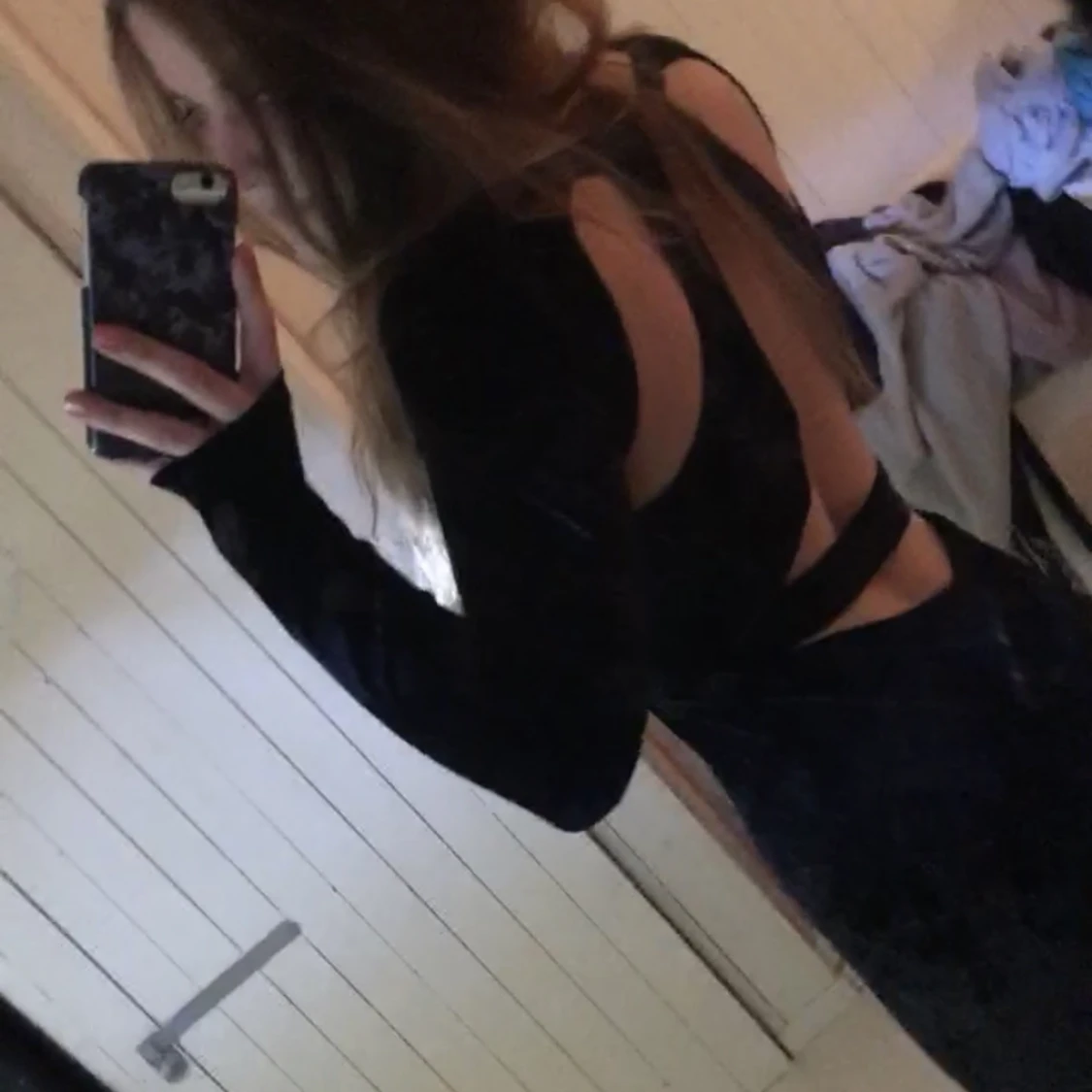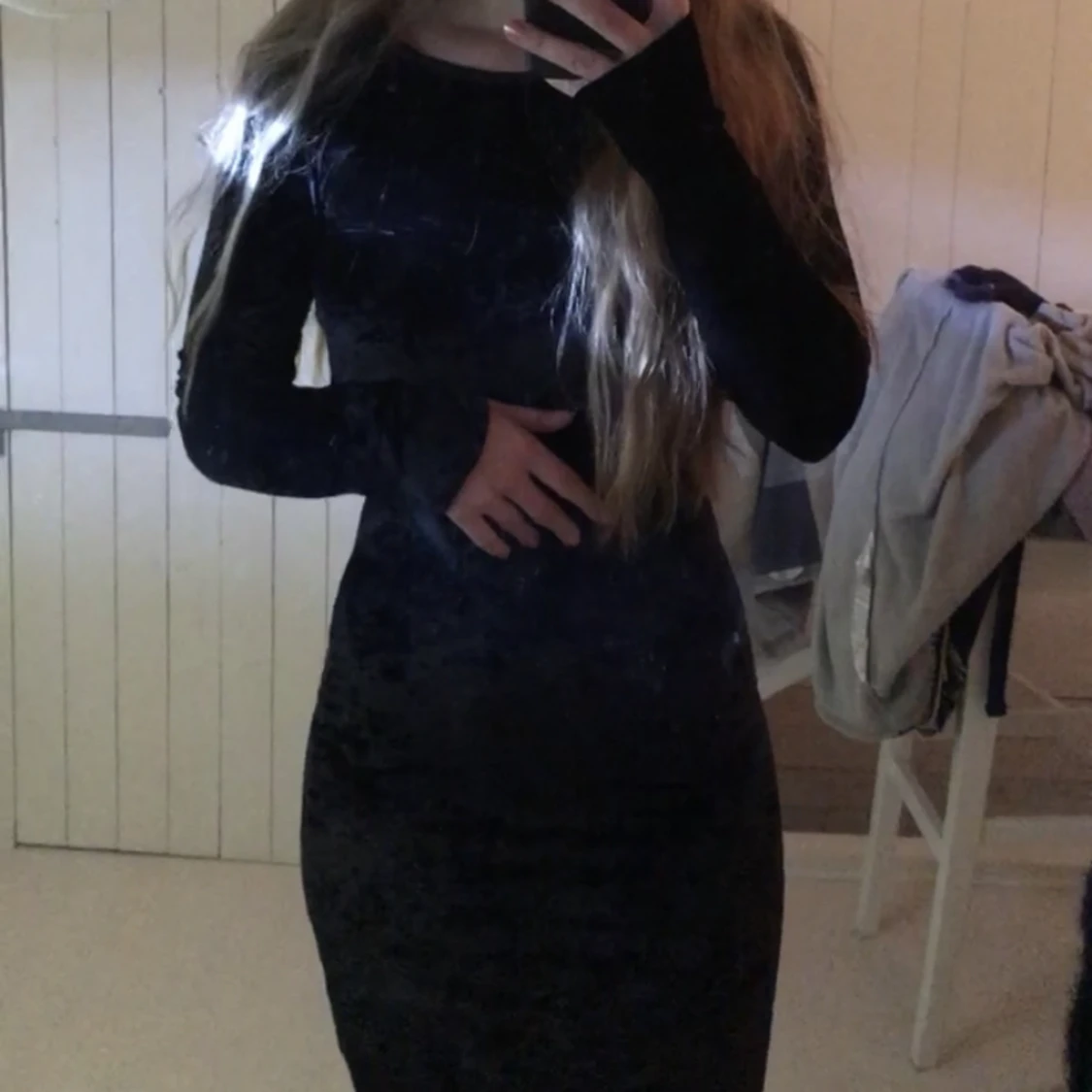 Svart sammetsklänning med öppen rygg. Klänningen är till knäna på mig. Storlek S🥰