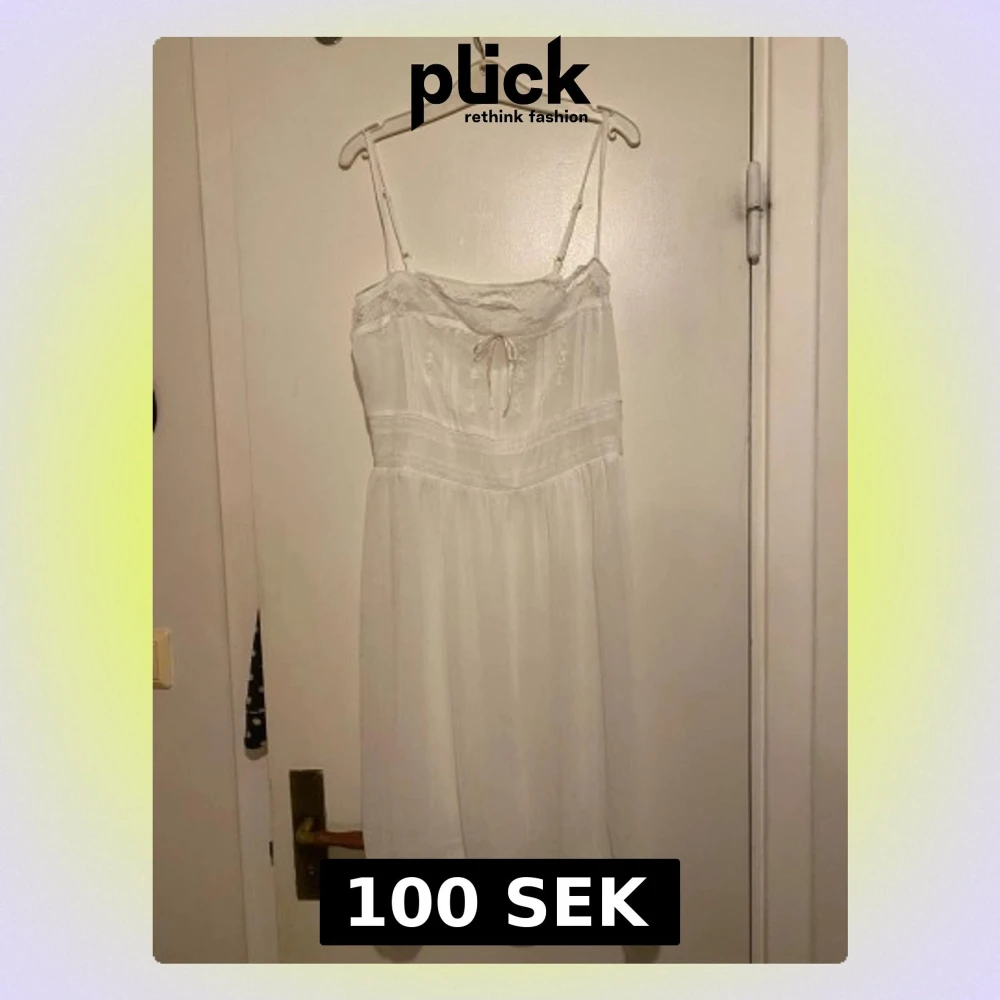 Romantiskt vit klĂ€nning med tunna justerbara axelband, spetsdetaljer upptill och nertill samt broderade blommor pĂ„ bröstet. Dekorativ rosett framtill och mjukt, luftigt tyg som ger en skön kĂ€nsla. Perfekt för dig som gillar en söt och klassisk stil. Notera att den Ă€r vĂ€ldigt genomskinlig sĂ„ man behöver bĂ€ra nĂ„got under denđđ