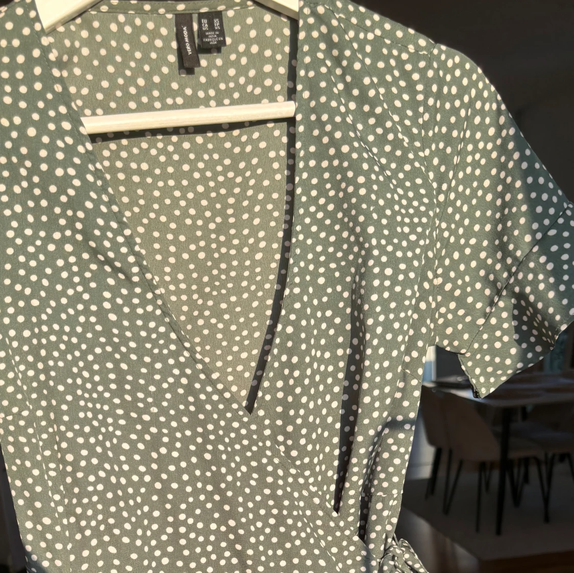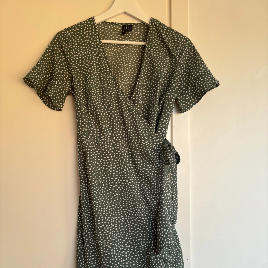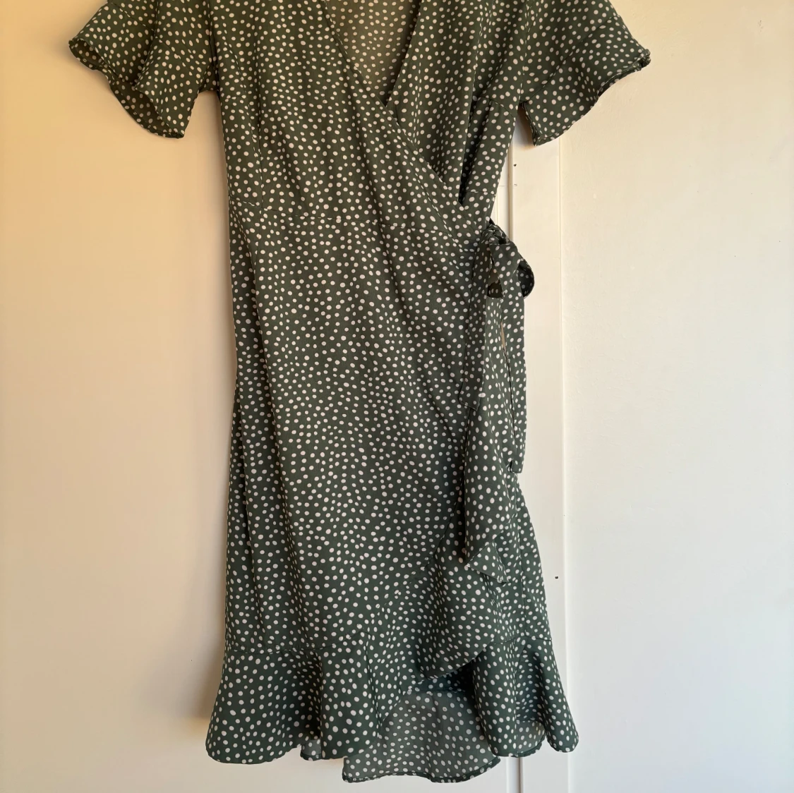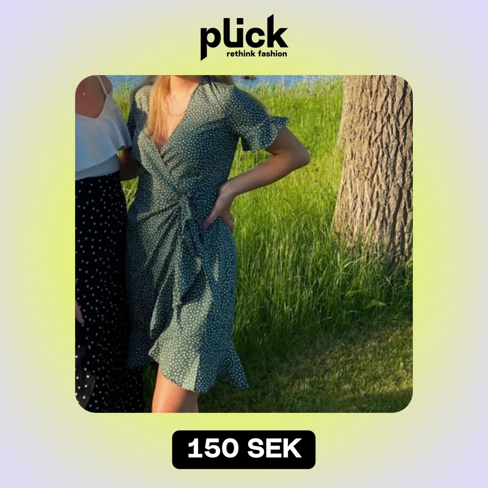 Sommarklänning i grön (svep för bättre bild på färgen, den är lite mörkare grön). I storlek XS men passar S också. Klänningen slutar strax innan knäna på mig och jag är 165cm (första bilden)