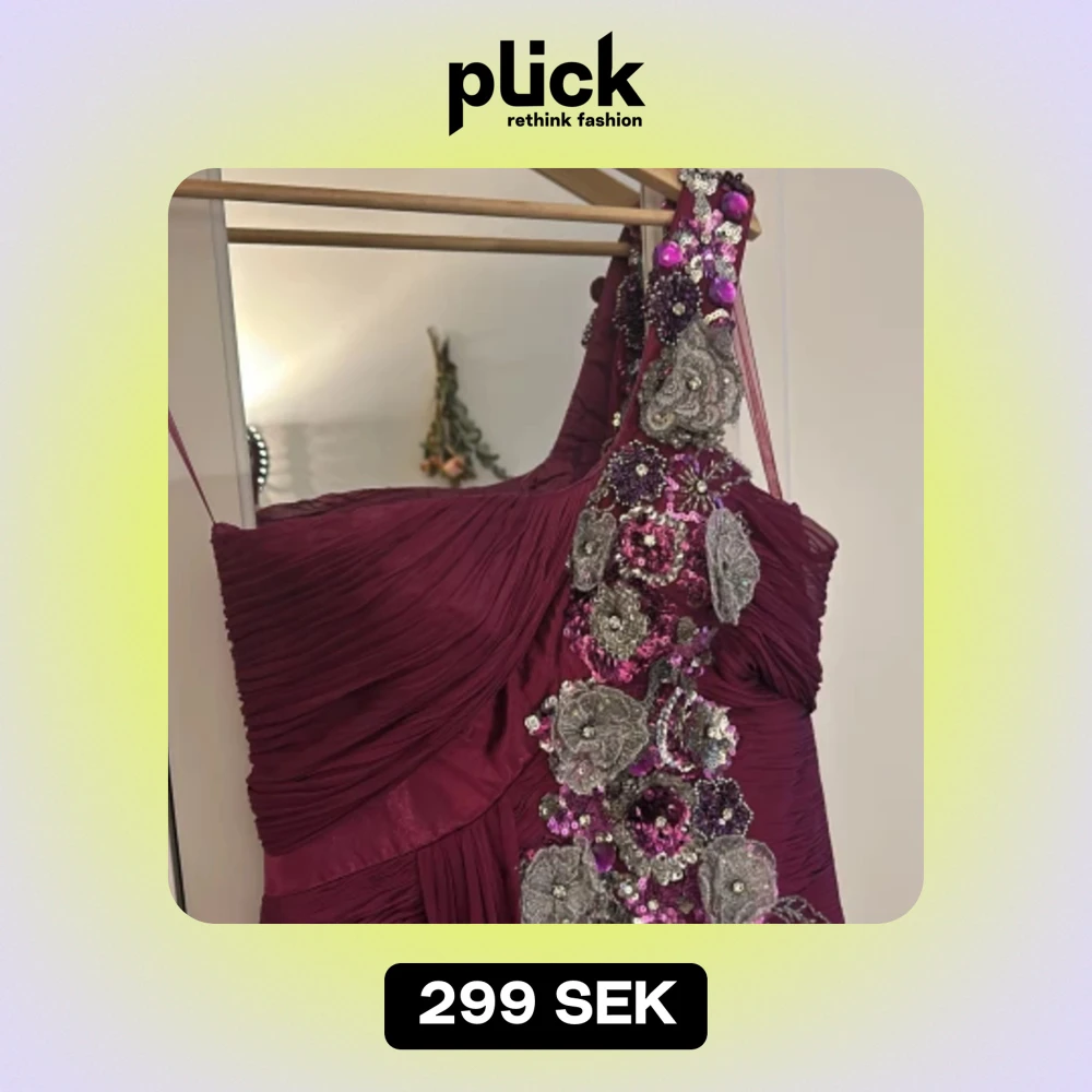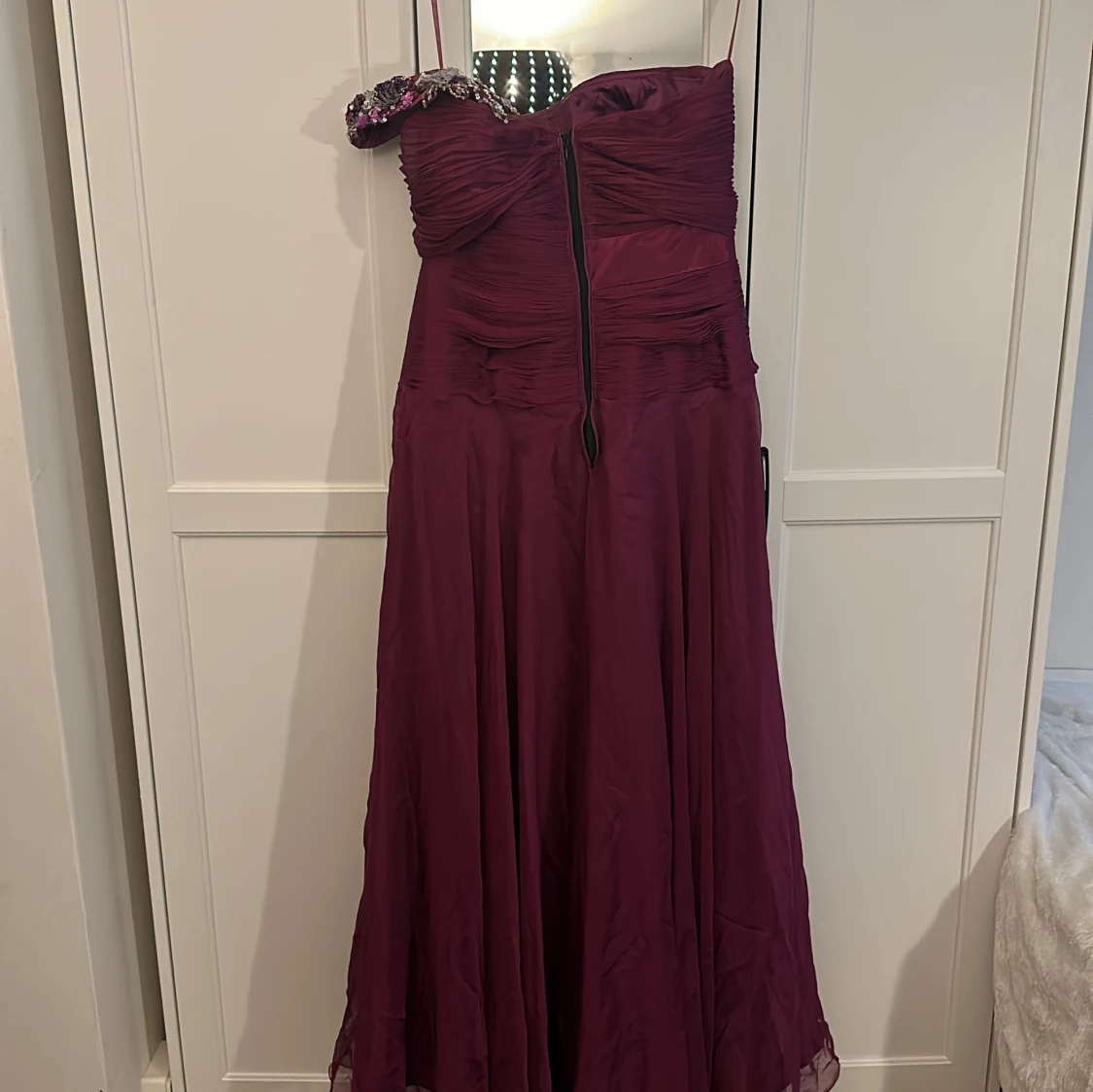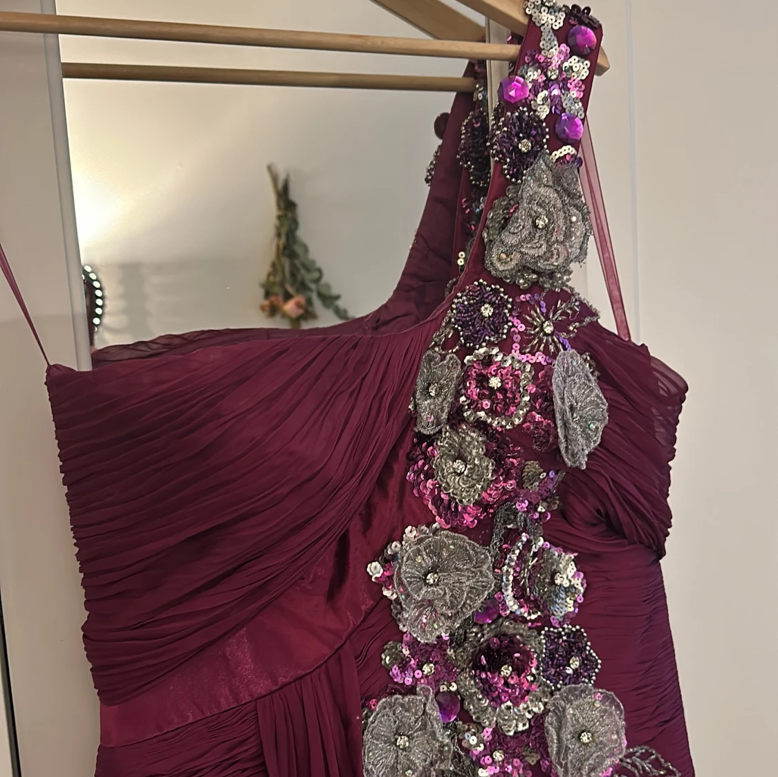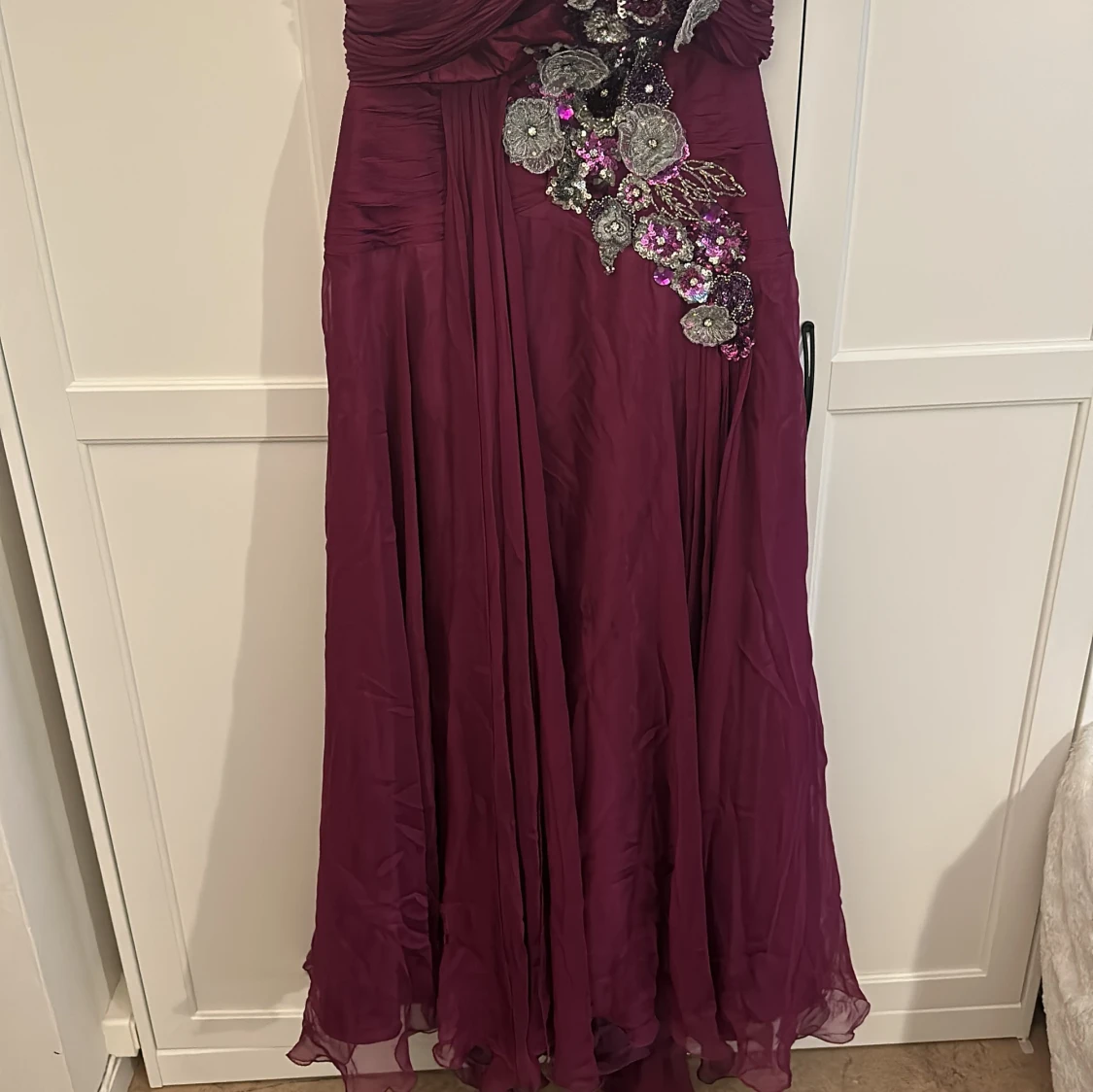 Lång magenta klänning med silver,grå och magenta strass samt blommor. Den är väldigt vintage och har många lager så det är därför den ser konstigt ut på bilden. Den är unik eftersom den är från Syrien innan kriget började. Ungefär 15 år gammal.