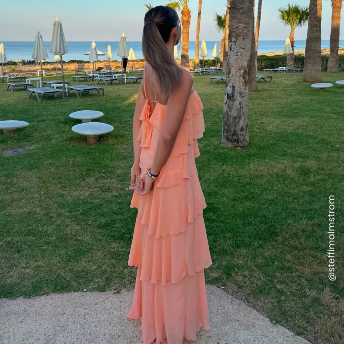 Jättefin volang klänning som endast är använd vid ett tillfälle, så är som ny. Storlek L men passar mig som vanligtvis har S och M, köpte större då jag är 173cm och ville ha den lång.