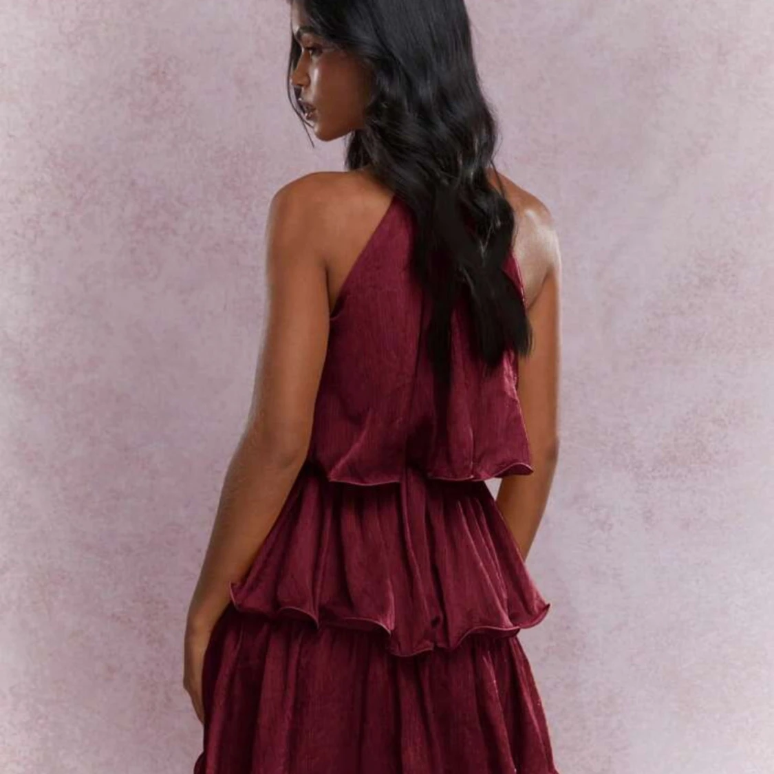 Supersnygg vinröd kortklänning med flera volanger och halterneck. Helt oanvänd, prislappen kvar!