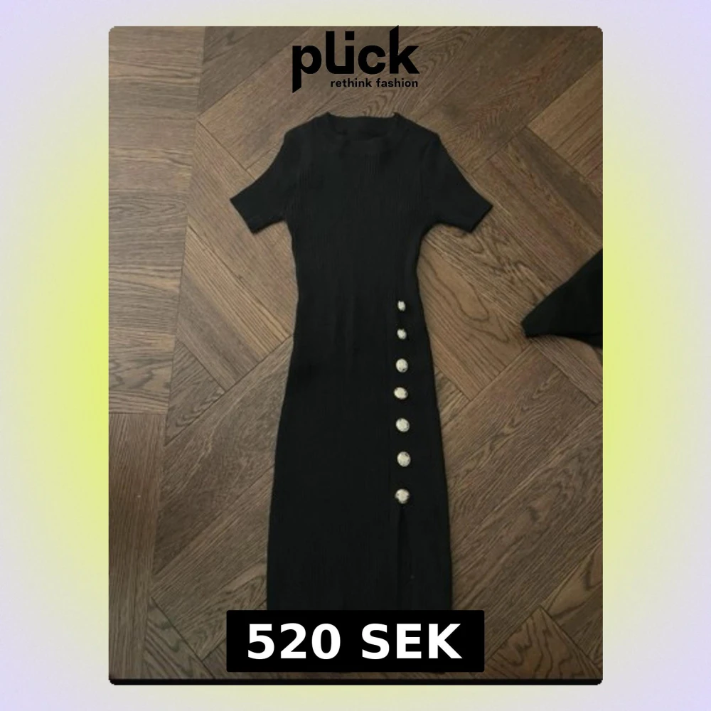 Snygg svart långklänning med ribbad struktur och korta ärmar. Klänningen har dekorativa silverfärgade knappar längs sidan och en liten slits nedtill. Perfekt för dig som gillar stilrena och trendiga plagg med coola detaljer.