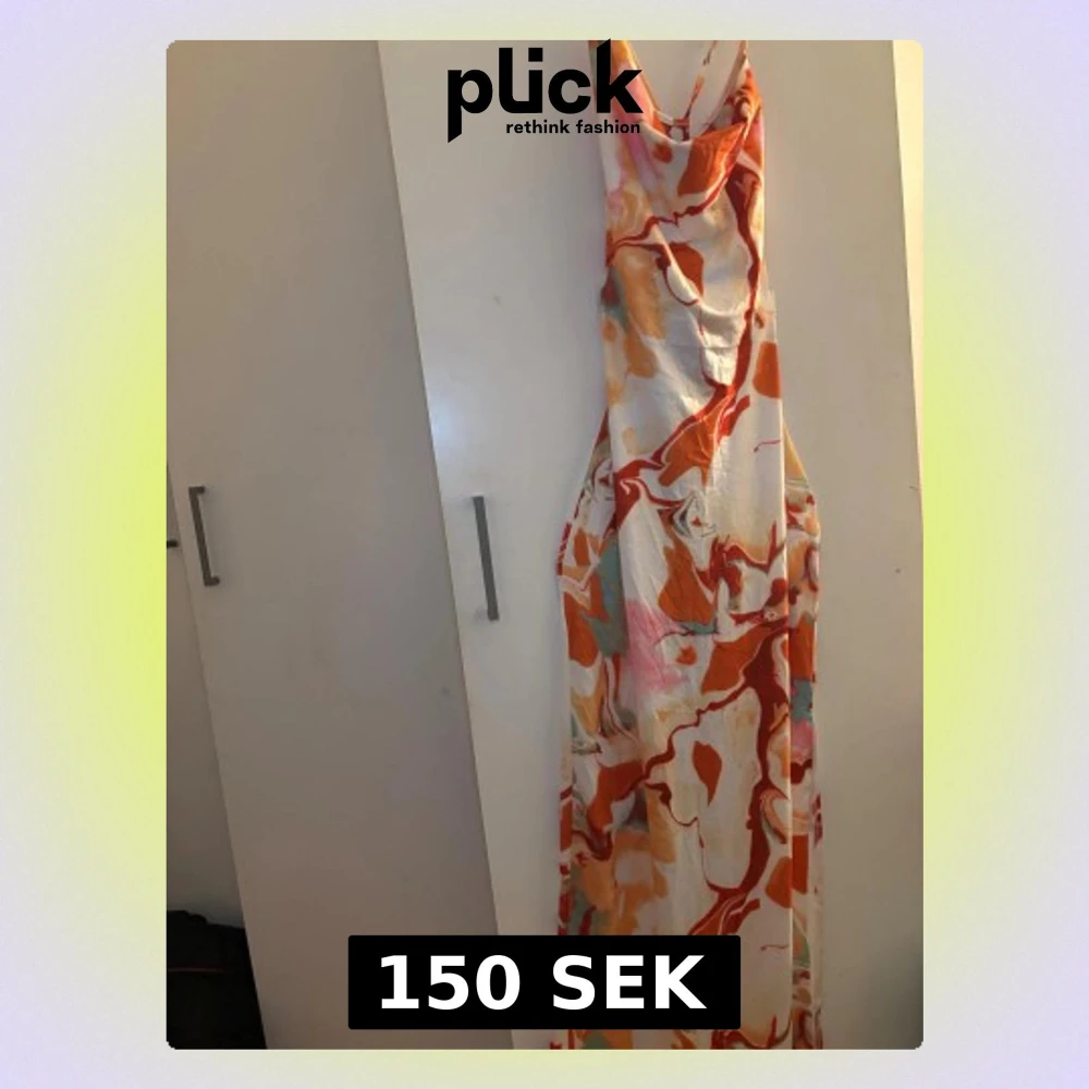 Säljer en maxiklänning med tunna axelband och coolt abstrakt mönster i orange, rött, rosa, beige och vitt. Klänningen har en flowy passform och är perfekt för dig som gillar att sticka ut med färg. Materialet känns lätt och svalt, och modellen är ärmlös med snygg rygg.
